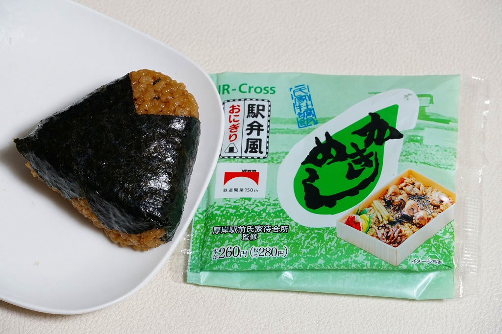 袋の絵柄はかきめしの掛紙から引用し、本物の見本写真も掲載。カキ煮を1個仕込んだ、ひじき入り炊き込みご飯を、海苔で巻く。内容は厚岸駅弁のかきめしと同じでも、痛いや臭いとも表現できるあの濃厚な風味はここになく、具にも飯にも甘味のみがあったが、さすがにこれは仕方がない。