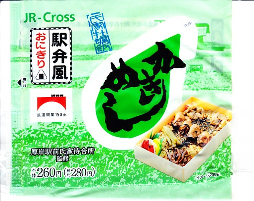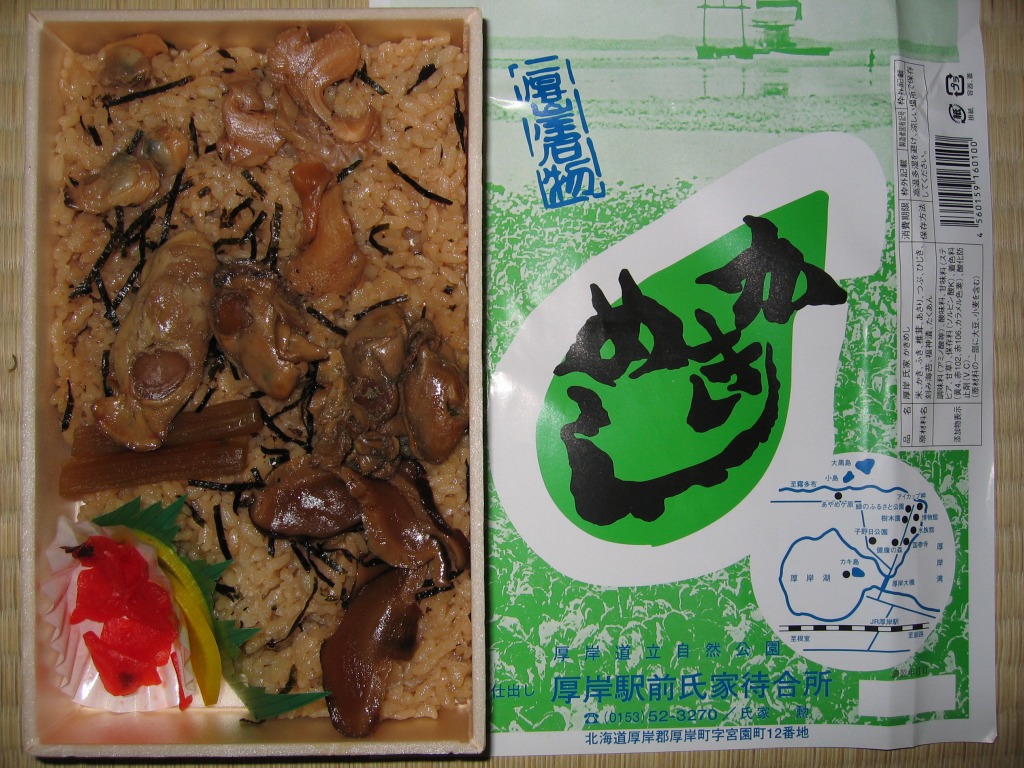 厚岸駅の名物駅弁「かきめし」について、本州など内地のスーパーやデパートでの駅弁催事で売られたバージョン。外観や中身や価格は、現地の駅弁「かきめし」と同じであるが、味はあっさりしていて、良く言えば都会的で悪く言えば磯の香りが足りない。どうも御飯に普通の茶飯を使っているらしく、それで味に差異が生じるのだろう。