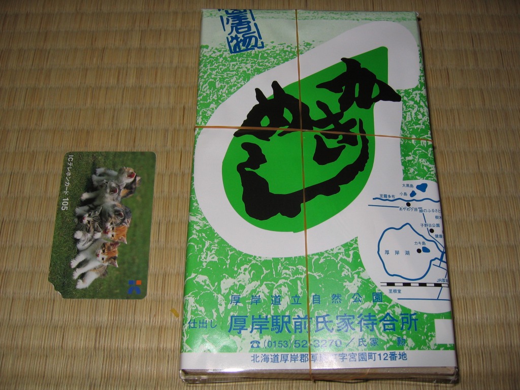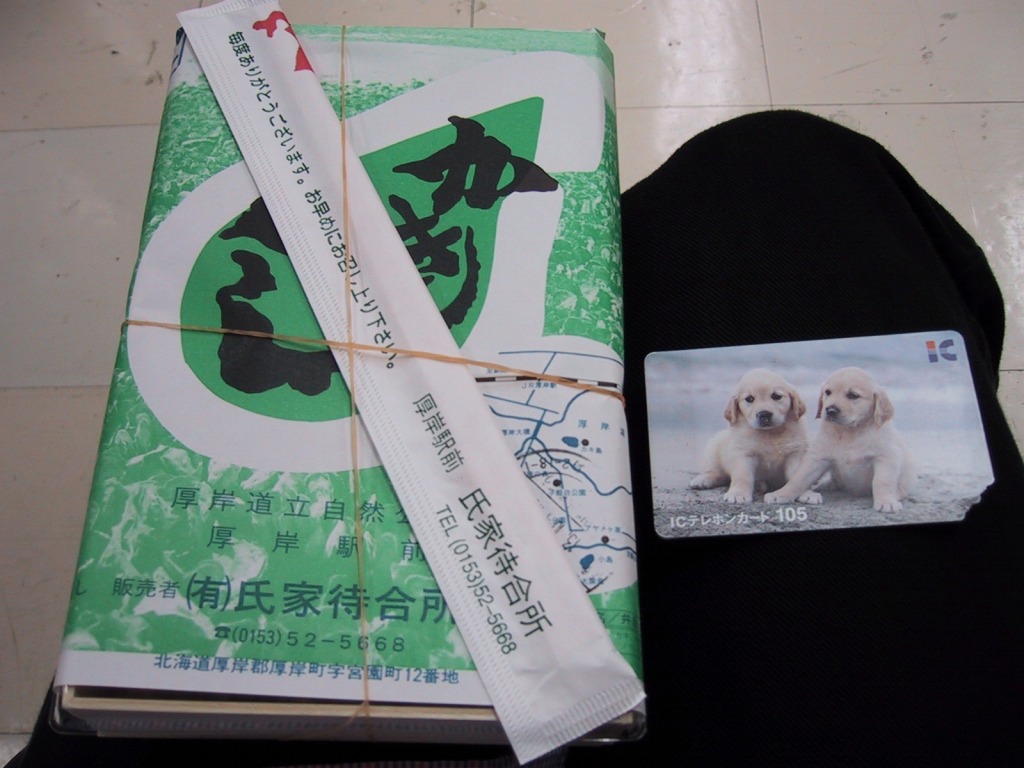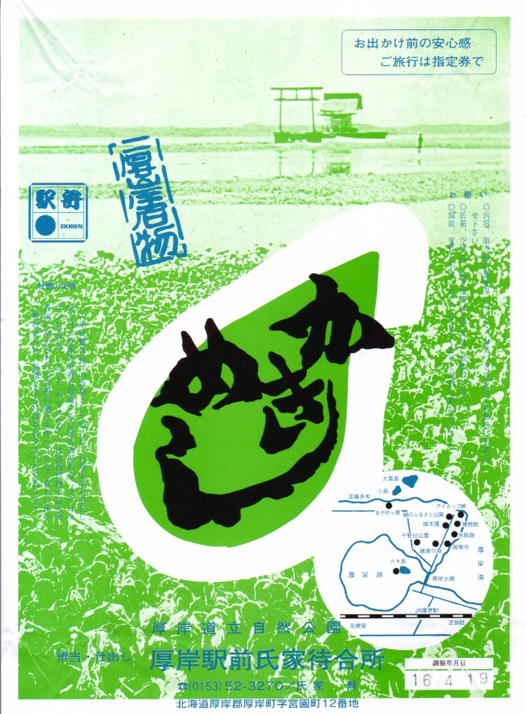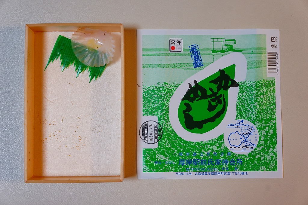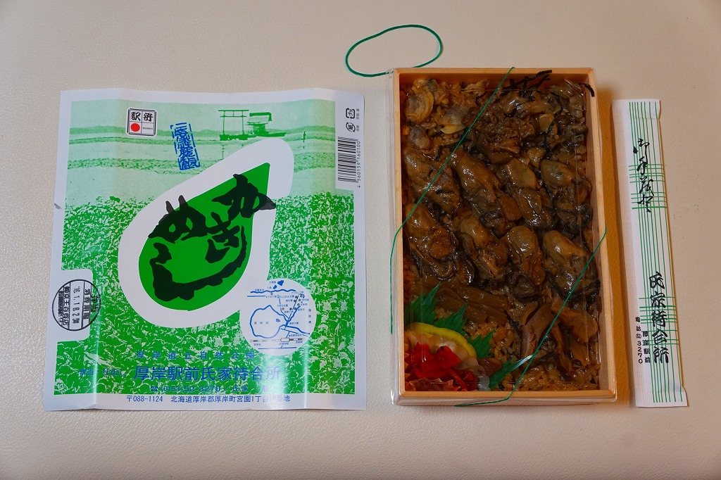 現地での収穫に約20年間失敗し続けるうちに、どうも厚岸の特産はカキでなくなったよう。掛紙の写真に残る厚岸湖での巨大なカキの林立はとうの昔に失われ、キヨスクも立ち売りもなくなった駅に残る町特産品のショーケースやチラシからカキが消え、厚岸蒸留所のジャパニーズウイスキーを推す。厚岸の鉄道や駅の存続も危なく、バイク乗りなど道路の客で安泰と思った駅弁もこんな現状。これでは2030年代にこの駅弁は、北海道に残らないかもしれない。