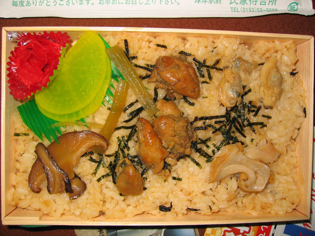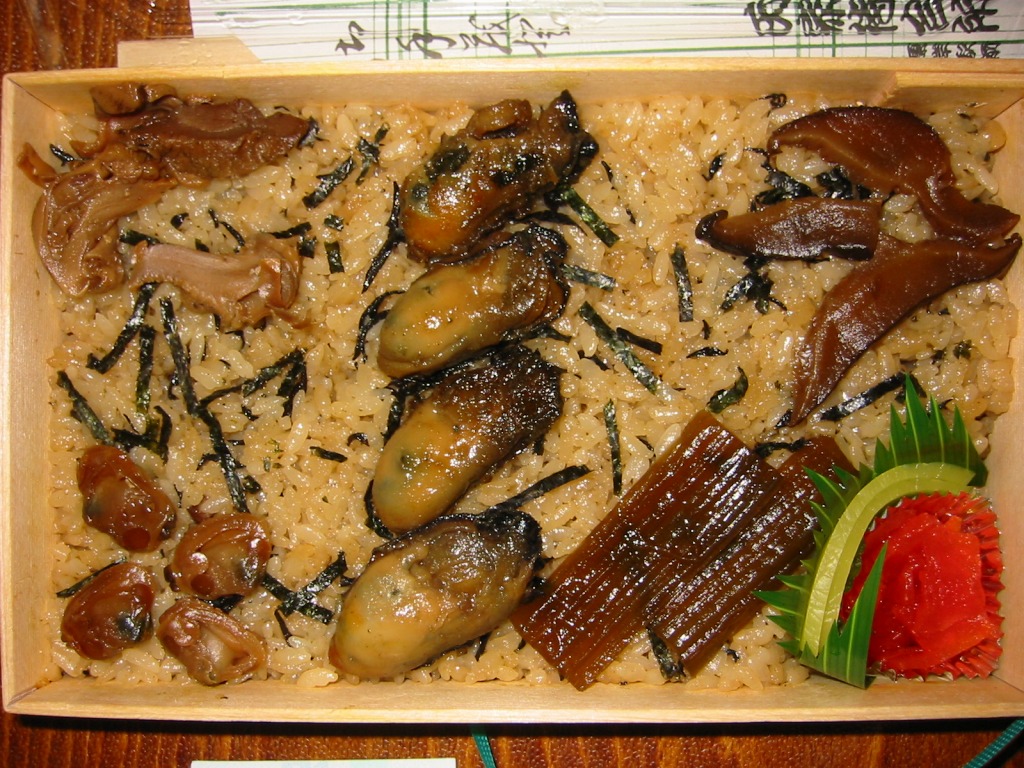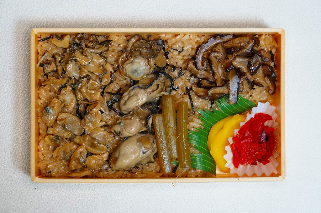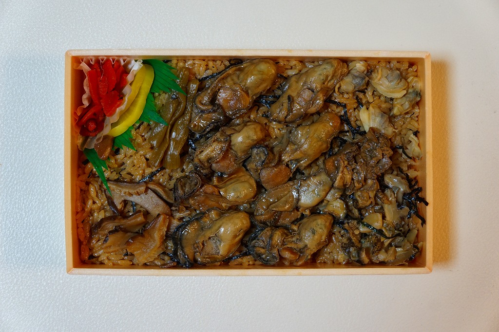浅い長方形の容器に、カキの煮汁で炊いた御飯を敷き詰め、カキ煮4個にフキやシイタケやアサリで覆い、たくあんと福神漬けを添える。そんな内容は昭和時代からおおむね変わらないようにみえる。しかしカキの量や香りは減り、濃厚な臭いや口が痛くなる味は消えたと感じる。都会や催事で売りやすい、買われやすく食べられやすい、製造委託に向いた内容になったのだろう。他の駅にない内容のカキ駅弁である個性は、残っていると思う。価格はおそらく現地と同じで、2023年の購入時で1,190円、今なら1,480円のはず。