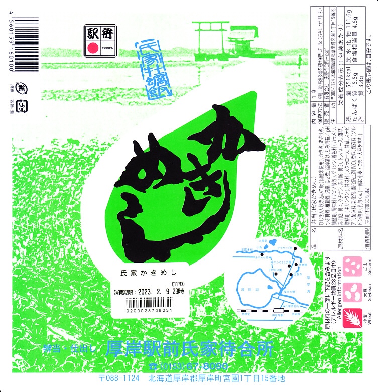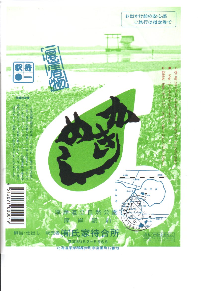 上記の駅弁「かきめし」を、東京駅の駅弁売店で購入したもの。2020年代にはこの駅弁はJR東日本管内の、東京、品川、新宿、上野、大宮駅などの首都圏や、東北上信越地方の主な駅で、一年中売られる商品となった。一方で北海道の厚岸駅では、木曜定休の駅前販売をうたうも、金曜に行くも土曜に行くも閉店で買えず、幻の駅弁、現地で買えない駅弁となっている。ネット上には、予約や問合せようにも電話に出てくれないという報告がみられる。その電話番号はいつしか、この掛紙のように下四桁「8090」のものに替わった。調製元の所在地は厚岸町字名改正事業により2006年11月に変わった。
