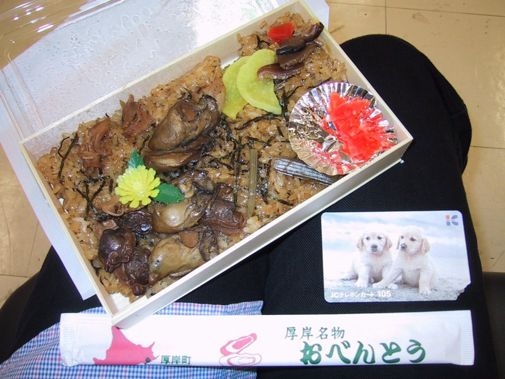 上記の駅弁「かきめし」を、2004〜2005年の駅弁大会シーズンに百貨店の駅弁催事で買ったもの。厚岸駅弁「かきめし」が、京王百貨店駅弁大会に9年ぶりに帰ってきた。しかし中身や価格は現地と同じでも、写真を見比べれば一目瞭然である具の少なさや小ささ、そして写真では分からない風味の薄さで、現地版とは別物だった。しかし、道東の小さな駅にはこのような駅弁があるという事実を、都会の買い物客や業者さんに宣伝する役割は、果たしていたと思う。