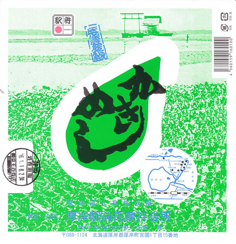 上記の駅弁「かきめし」を、2005〜2006年の駅弁大会シーズンにスーパーで買ったもの。どうもこのシーズンから製造委託のやり方を変えたようで、現地と催事で掛紙に記載される調製元の電話番号が同じになったほか、実演でない販売が広く行われるようになった。厚岸駅で買える駅弁を他所で再現して、自社や地域のPRに励むことは、悪くないと思う。