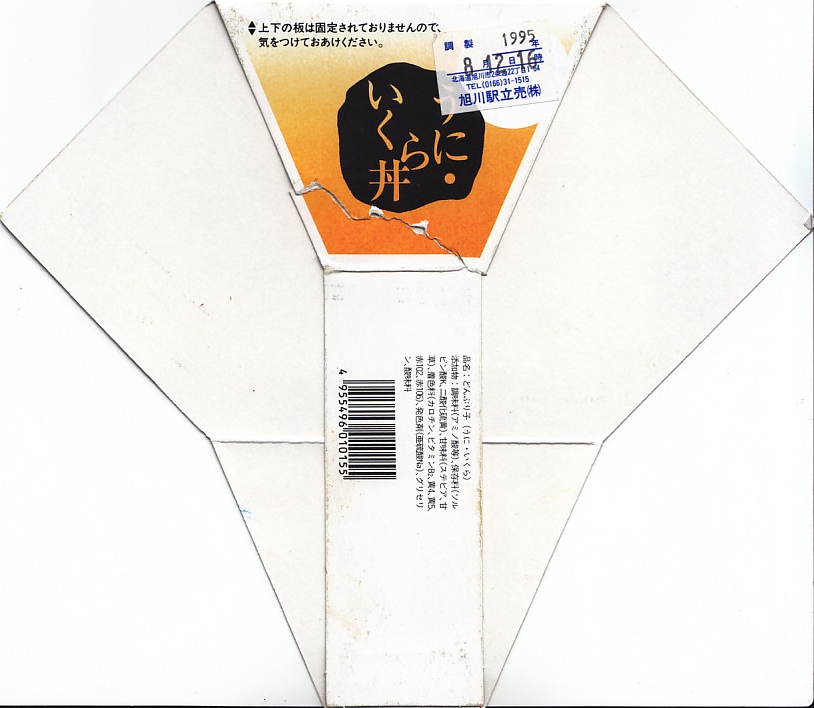 1995(平成7)年8月12日の調製と思われる、昔の旭川駅弁のスリーブ。当時は2002年購入のものと同じふたつの容器を並べ、上下に長方形の板を当て、このスリーブに差し込んでいたようで、これに関する注意書きも見える。