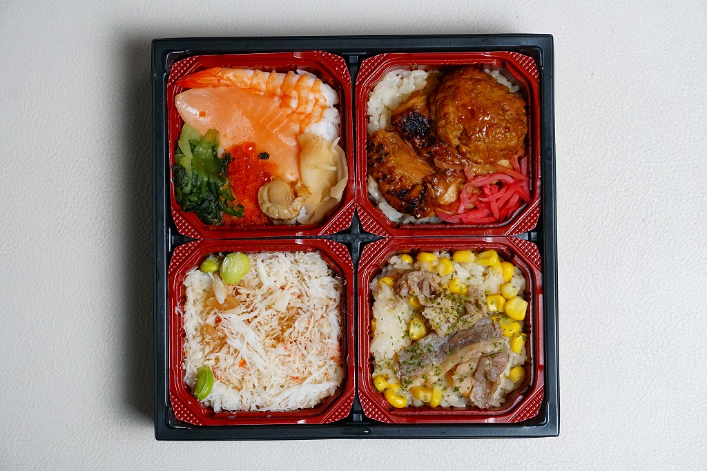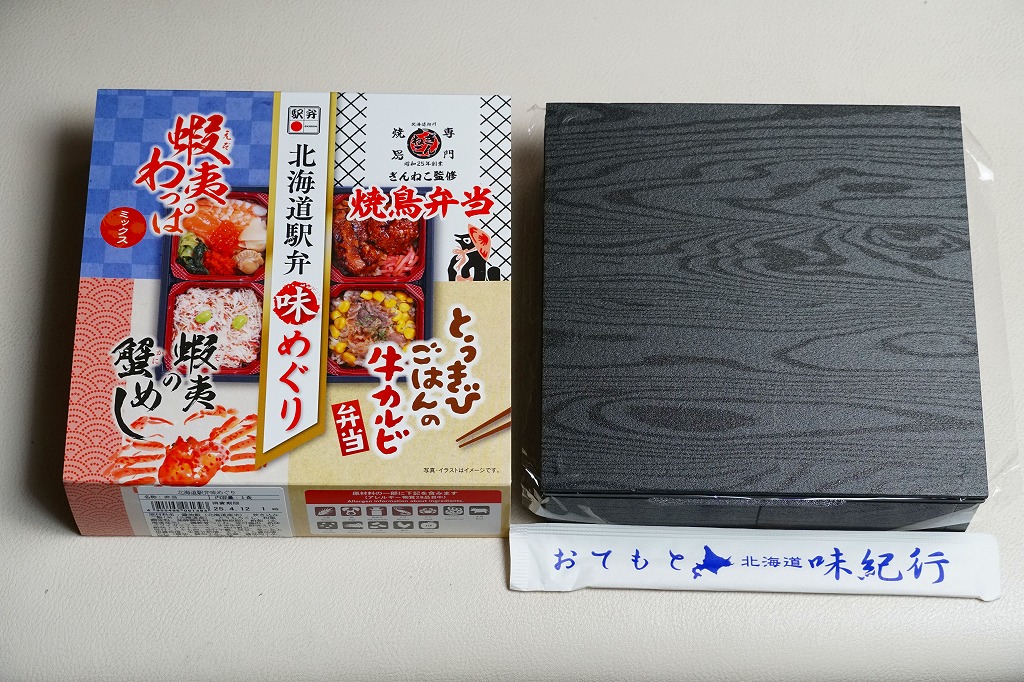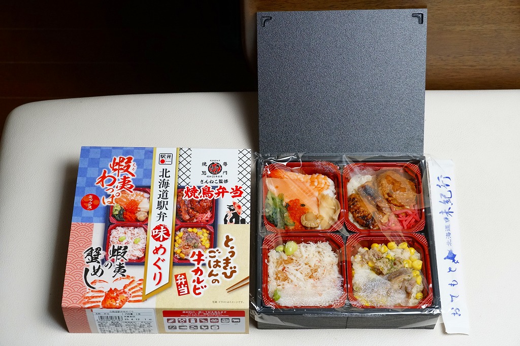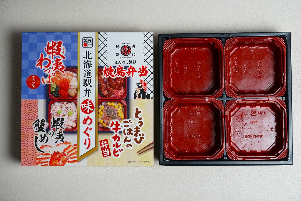 2025(令和7)年2月3日に東京駅の駅弁売店「駅弁屋 祭」で発売と発表。実際には秋冬の駅弁大会シーズンに向けた、2024(令和6)年秋の新商品ではないか。スリーブに並べた名前や写真のとおり、既存の旭川駅弁「蝦夷わっぱ」「焼鳥弁当」「とうきびごはんの牛カルビ弁当」「蝦夷の蟹めし」のミニ版の詰合せ。松花堂弁当のように配した4つの正方形に、酢飯や茶飯を詰めて、ちらしずし、焼き鳥と鶏肉団子、コーンや牛肉、カニほぐし身などで覆ったものを、ひとつずつ詰めた。旭川駅の駅弁だけをめぐっても、これだけ幅広いラインナップなので、北海道駅弁をめぐったように見える。