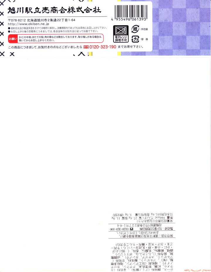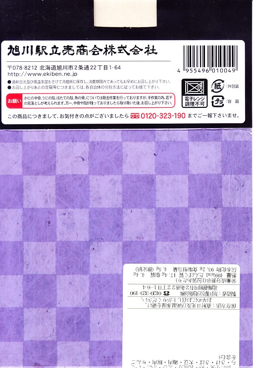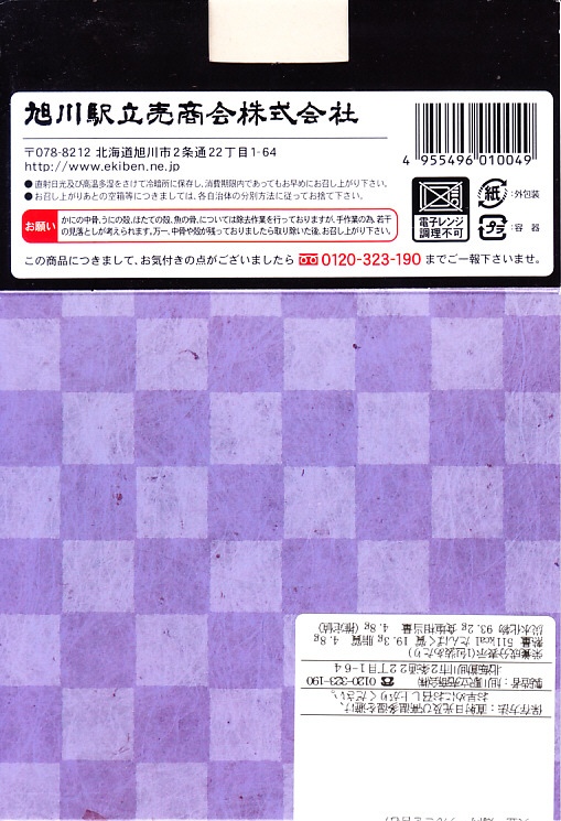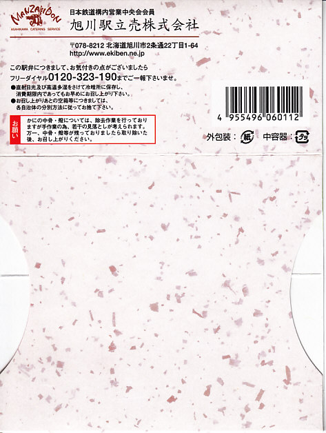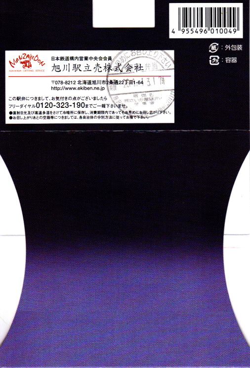 2005(平成17)年11月12日に購入した、旭川駅弁のスリーブ。上記の2014年のものと変わらない。調製元の情報の印刷内容が、ちょっとだけ違う。中身も中身の見本写真も変わらない。