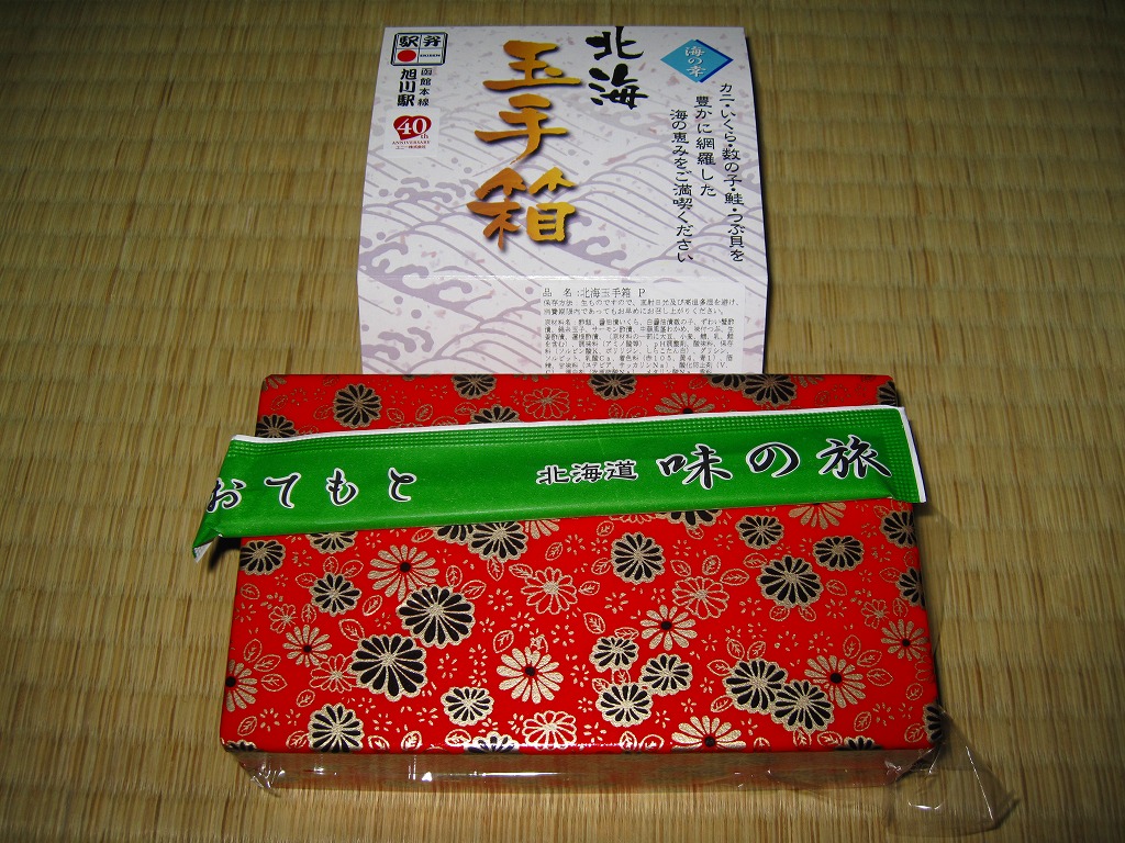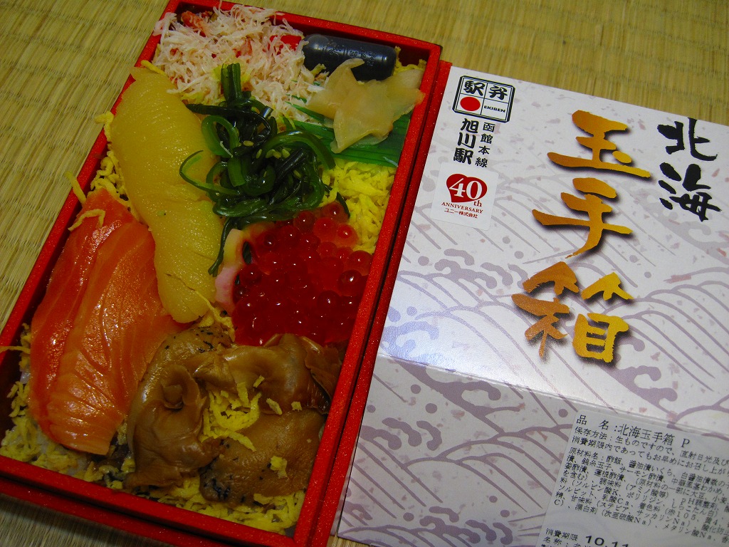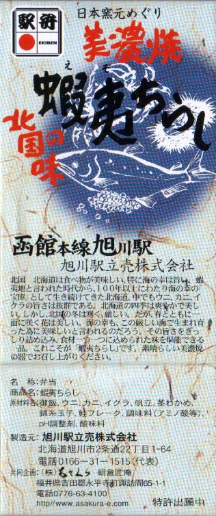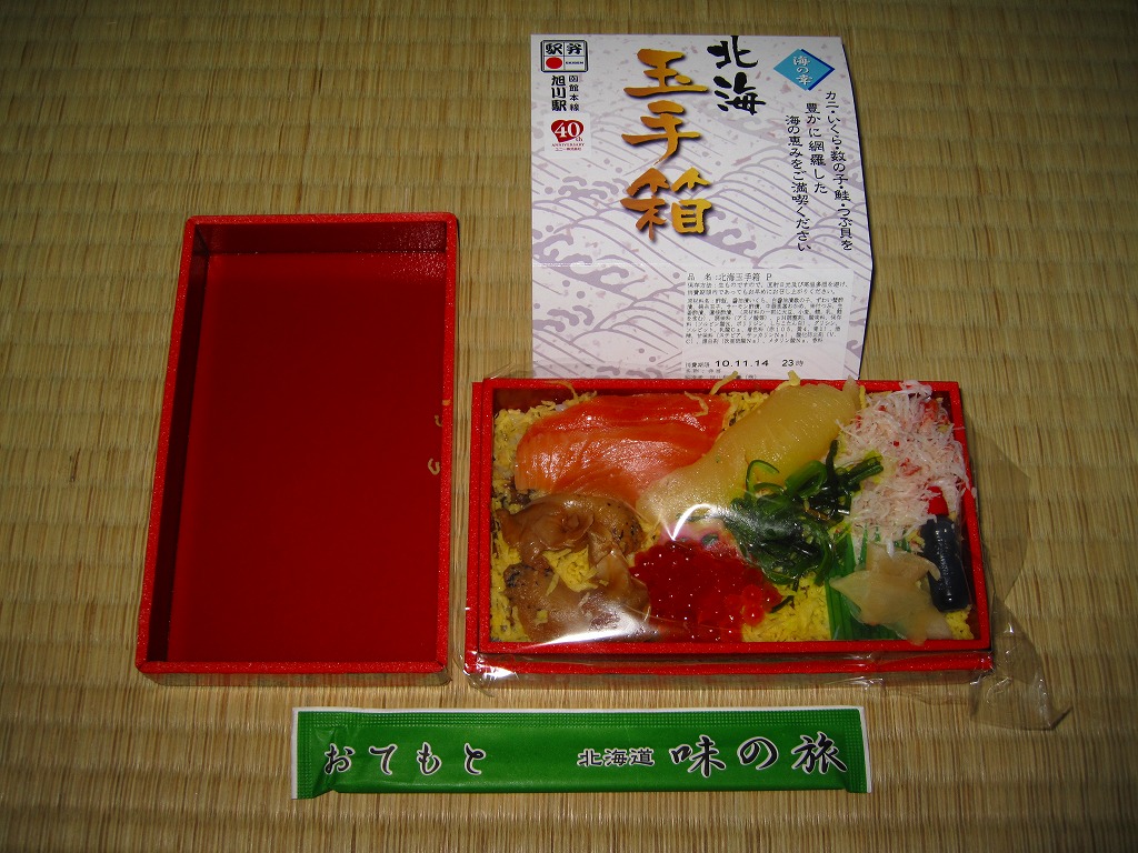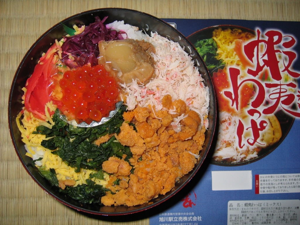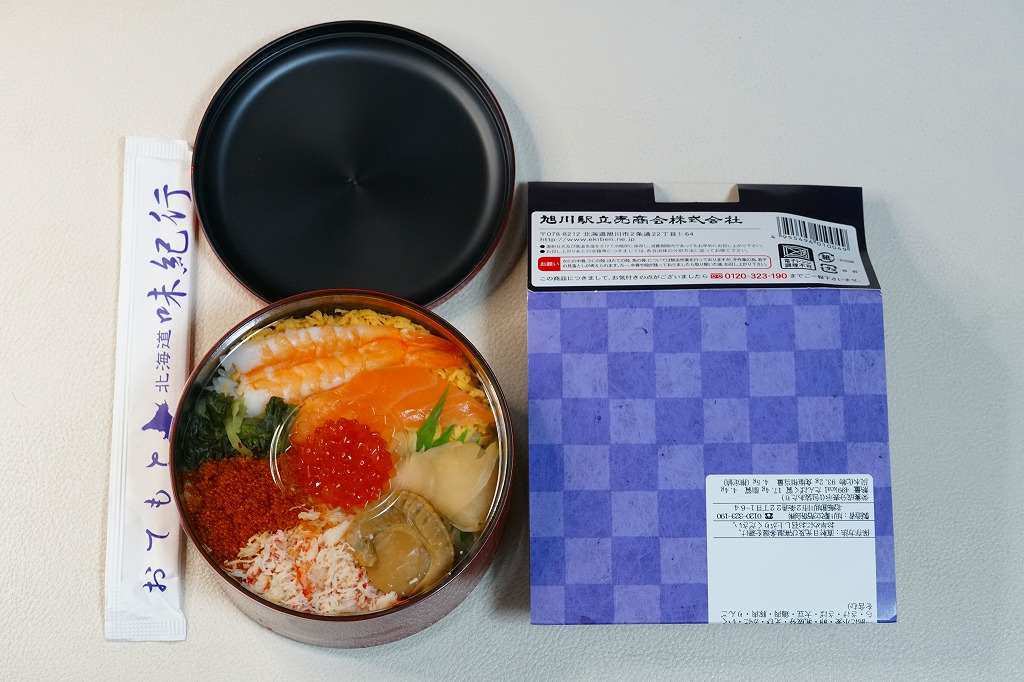 2002(平成14)年に発売。なぜか岐阜県美濃焼の美しい容器を使用し、中身は酢飯の上にウニ、カニ、イクラ、帆立、ワカメ、鮭などが載る、他の旭川駅弁とよく似た内容。味も同じようにうまい。