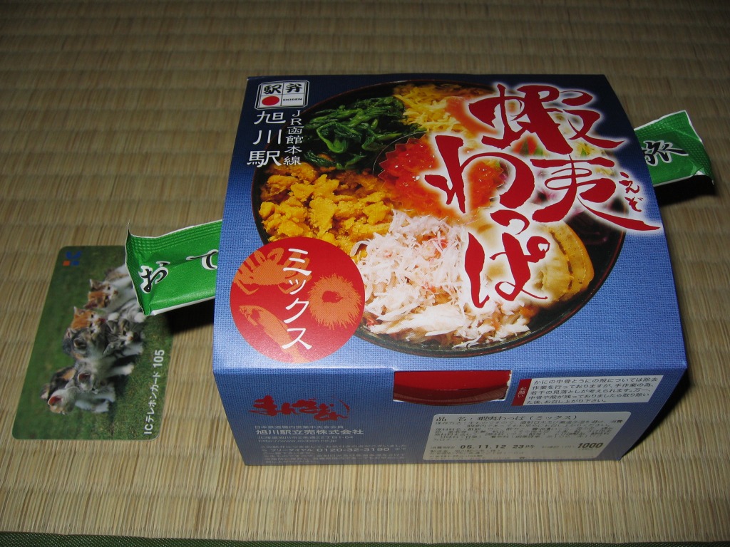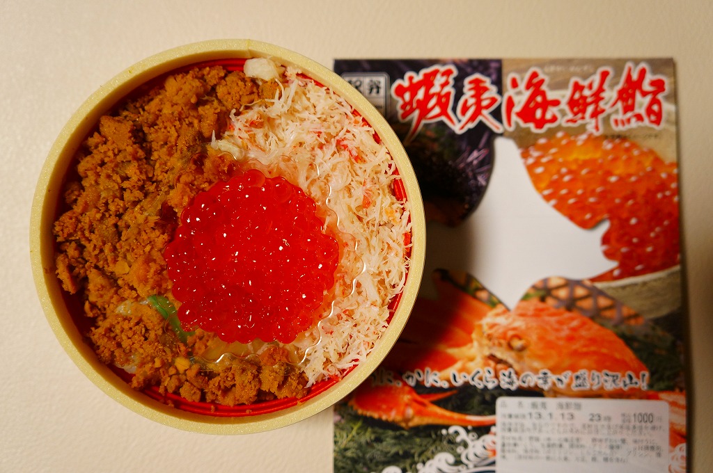2012(平成24)年秋の新発売またはリニューアルか。円形の容器に酢飯を詰めて、ズワイガニのほぐし身とウニのそぼろを敷き、イクラ醤油漬のカップを載せたもの。北海道や旭川の駅弁、あるいは北海道催事の弁当として、何の特徴もないと思うが、駅弁らしい、旭川らしい味ではある。価格は2013年の購入時で1,000円、2014年時点で1,080円。2016年までの販売か。