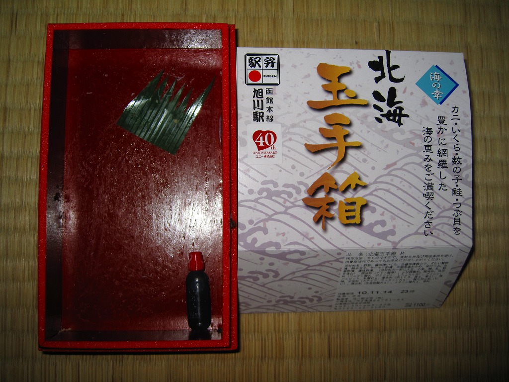 秋冬の駅弁大会シーズンに向けた、2007(平成19)年秋の新商品か。豪華な雰囲気の絵柄を印刷した赤い容器を、商品名を描いたボール紙の枠にはめる。中身は酢飯の上に錦糸卵を敷き、ズワイガニの酢漬けのフレーク、イクラの醤油漬、カズノコの白醤油漬け、サーモンの酢漬け、味付つぶ貝、茎わかめで覆い、生姜酢漬と醤油を添えるもの。高くて小さい駅弁であり、今回はスーパーの駅弁大会での販売ということでなんでも酢漬けにしているのかもしれないが、玉手箱の豪華さを持っていると思う。2015年頃までの販売か。