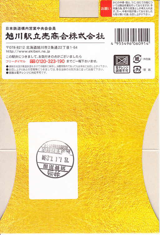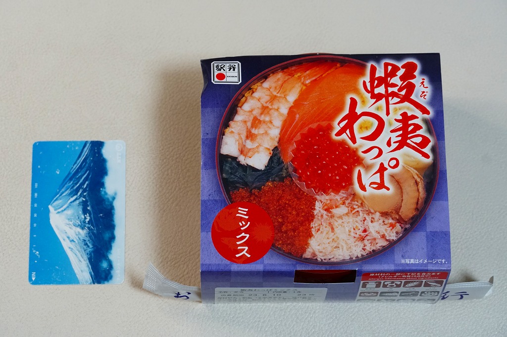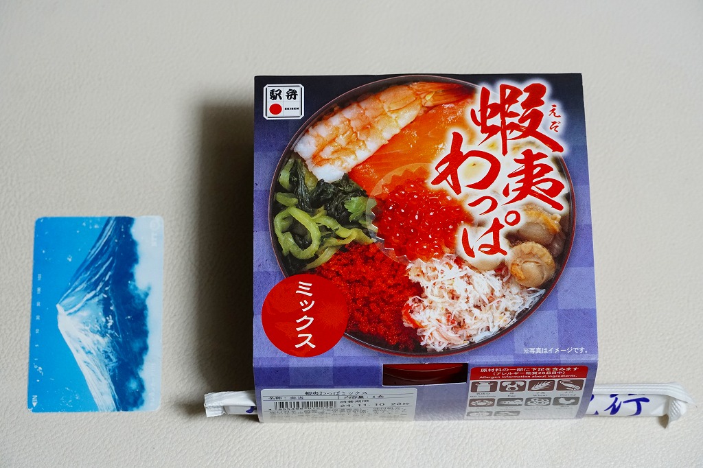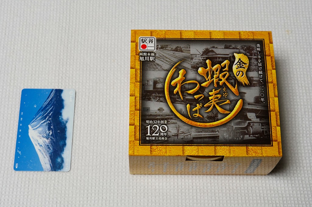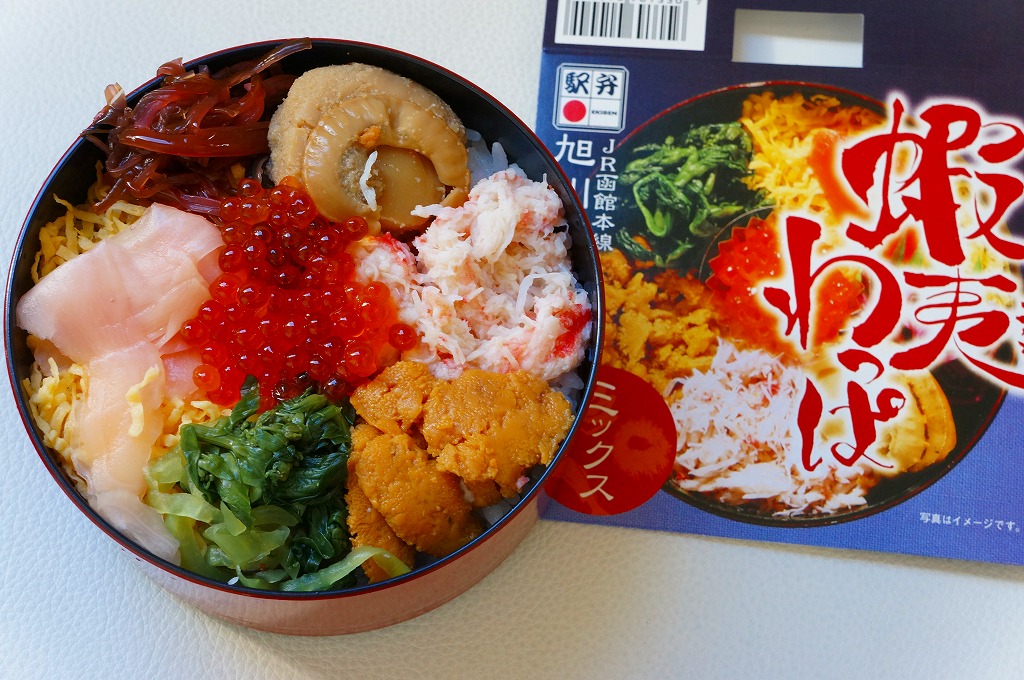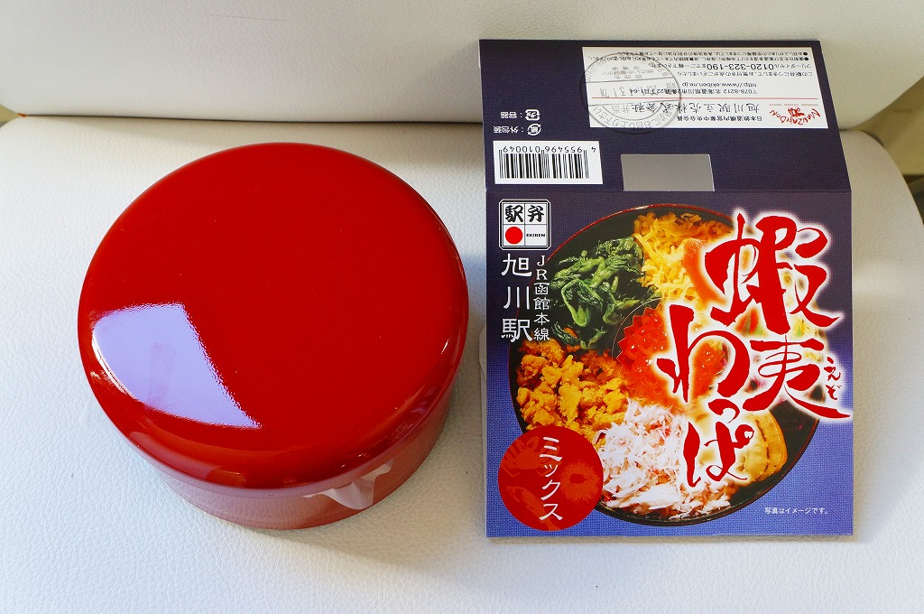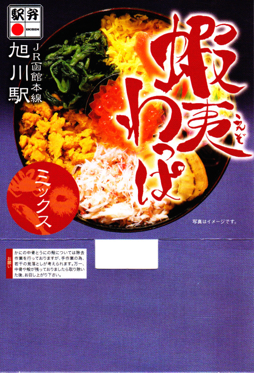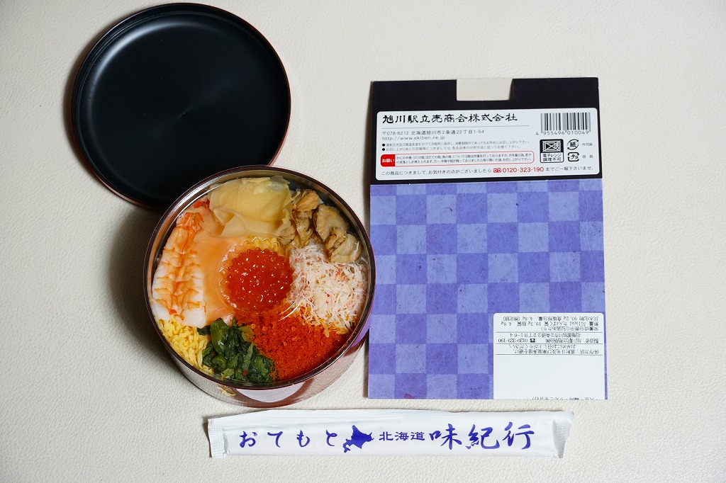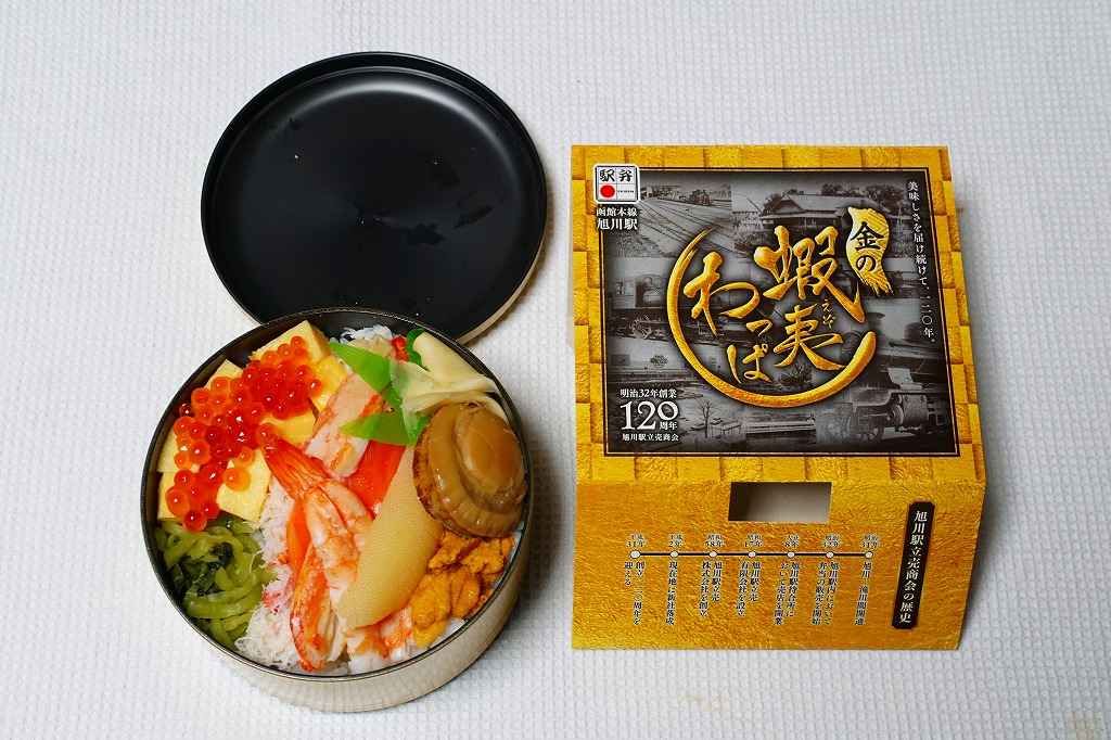 2019(平成31)年1月の京王百貨店の駅弁大会や阪神百貨店の駅弁大会で実演販売。調製元の創業120周年記念の駅弁だそうな。スリーブの上面には旭川駅の昔の写真がデザインされ、側面に調製元の歴史を記す。丸い金色のプラ容器に酢飯を敷き、えび、かに、サーモン、ホタテ、ウニ、カズノコ、玉子焼、お新香、ガリで覆う。下記の駅弁「蝦夷わっぱミックス」の上等版のようだが、印象は同じ。1年間ほどの販売か。