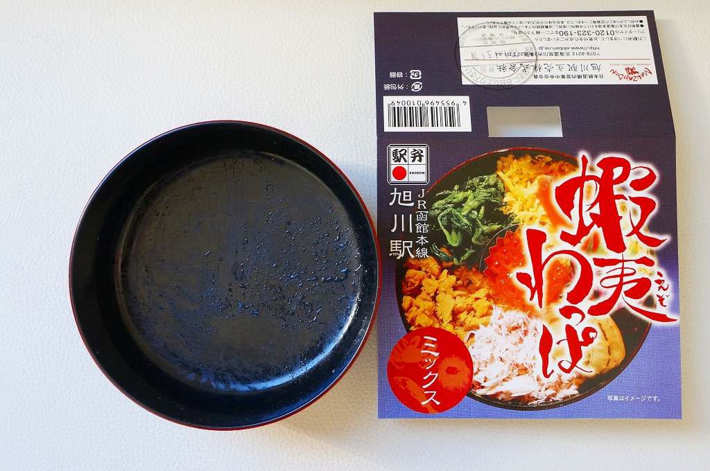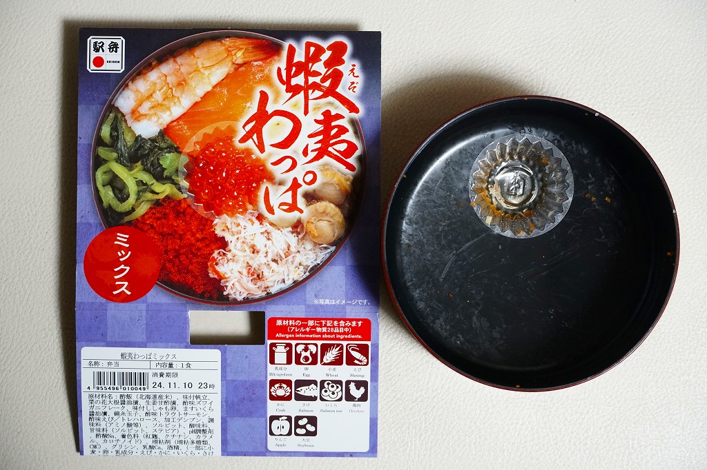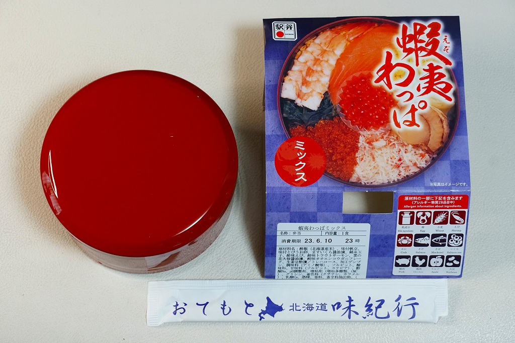 1985(昭和60)年頃に旭川駅で発売。盆地の町に海の幸。丸い漆器風のプラ容器に酢飯を詰め、ホタテ、ししゃも卵、錦糸卵、酸味えび、酸味トラウトサーモン、菜の花大根醤油漬け、酸味ズワイガニフレーク、甘酢生姜で覆い、ますいくら醤油漬を据える。いろんなものが載るから「ミックス」。いろいろ食べられて、楽しい駅弁。価格は2010年時点で1,000円、2014年4月の消費税率改定で1,030円、2015年時点で1,050円、2021年時点で1,180円、2024年時点で1,290円、11月時点で1,390円。2013年頃までは「ミックス」に加えて、ウニやカニやイクラの「蝦夷わっぱ」もあったが、今はこの「ミックス」だけが現存。