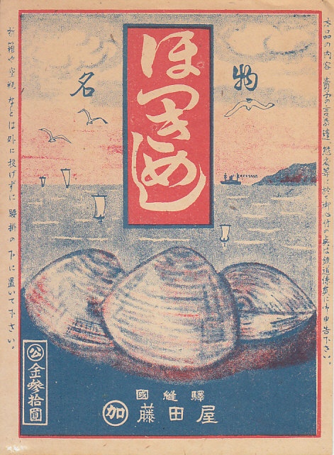 1940年代のものと思われる、昔の国縫駅弁の掛紙。内浦湾とホッキ貝を描いたものだろう。国縫駅のほっきめしは名物の駅弁として、1930年代から1960年頃まで売られた。