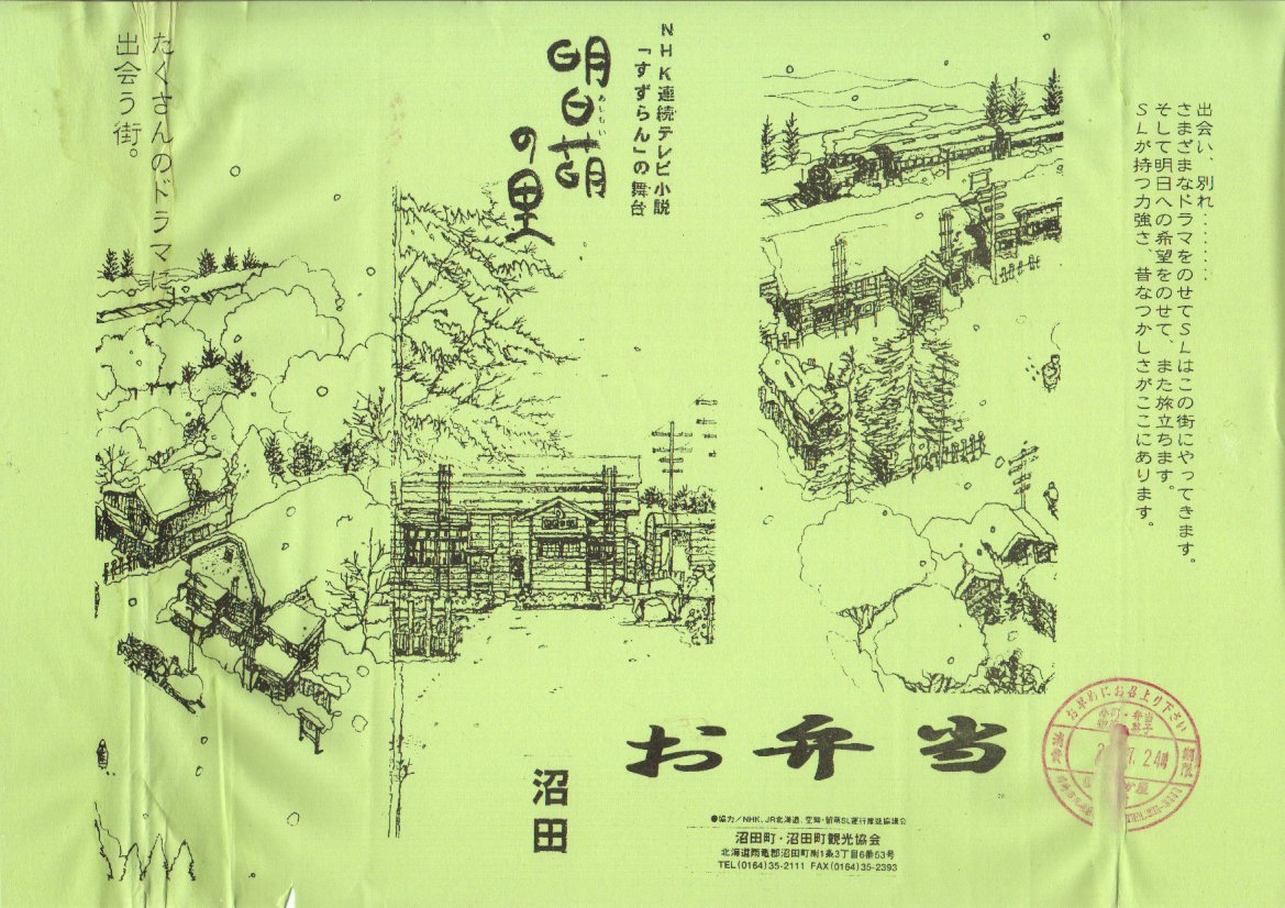 これは駅弁でなく、デパートの催事場で売られた弁当で、北海道雨竜郡沼田町と沼田町観光協会の町おこし弁当かもしれない。緑色のA4判OA用紙の掛紙には、1999(平成11)年度前半のNHK連続テレビ小説「すずらん」の文字や、番組で登場した駅舎や町並みを印刷する。中身はしめじめしとケチャップライスに、ホタテ、シイタケ、ウナギ、玉子焼、かまぼこと、おかずが少々。これで1,050円とはずいぶんと高いが、百貨店の催事へわざわざ弁当を買いに来る客が相手であれば、価格はそれほど重要視されないだろうから、これでよい。