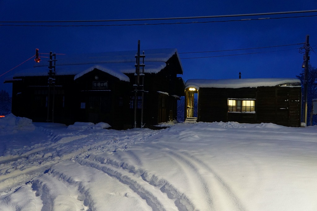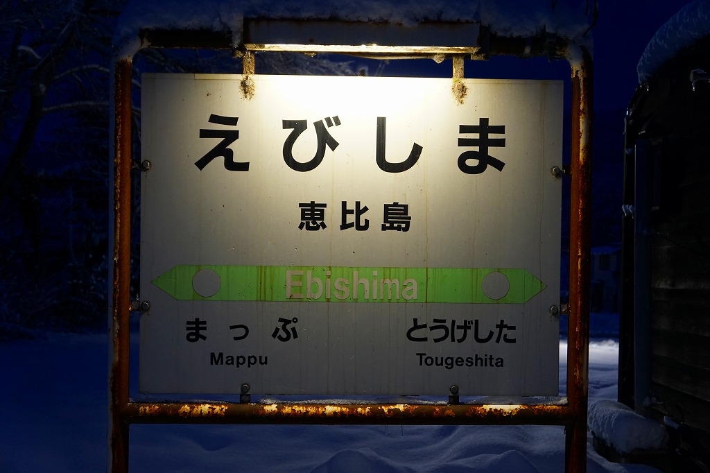 留萌本線で深川駅からも留萠駅からも約30分。かつてここは石炭や木材を積み出した駅であり、駅前に旅館や商店があり、大正時代には駅弁が売られた。1999年のNHK連続テレビ小説「すずらん」の撮影に用意した駅舎や旅館が残る。1910(明治43)年11月23日開業、北海道雨竜郡沼田町字恵比島。