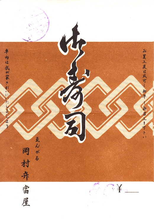 1957(昭和32)年6月23日の調製と思われる、昔の遠軽駅弁の掛紙。遠軽駅で当時普通とされた幕の内や寿司が売られたのは、1960年代までのことか。