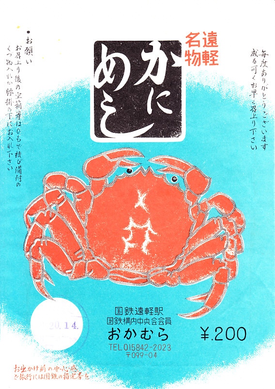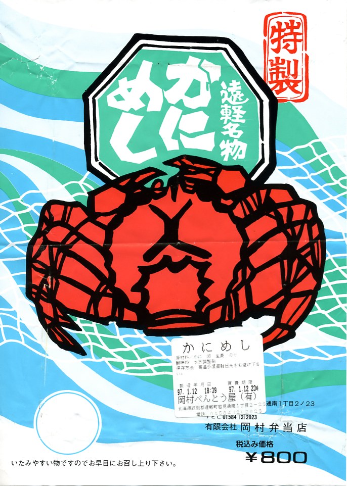 1970年代の調製と思われる、昔の遠軽駅弁の掛紙。絵柄は上記のとおり変遷したが、カニを赤く描いた青い掛紙であることは変わらない。