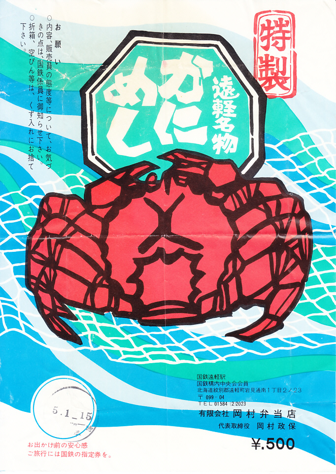 昭和50年代のものと思われる、昔の遠軽駅弁の掛紙。そのカニと網と海の絵柄は、21世紀のものとまったく変わらない。注意書きや調製元表記などの文字は、時代のルールに応じて変わってきた。当時の遠軽駅は石北本線が名寄本線を分ける駅であった。