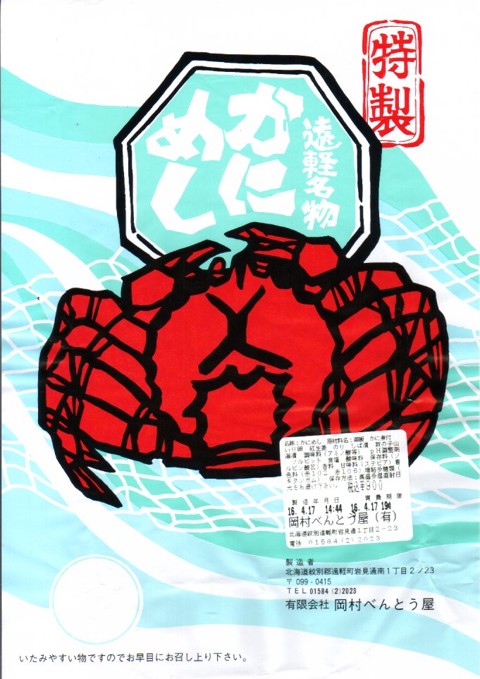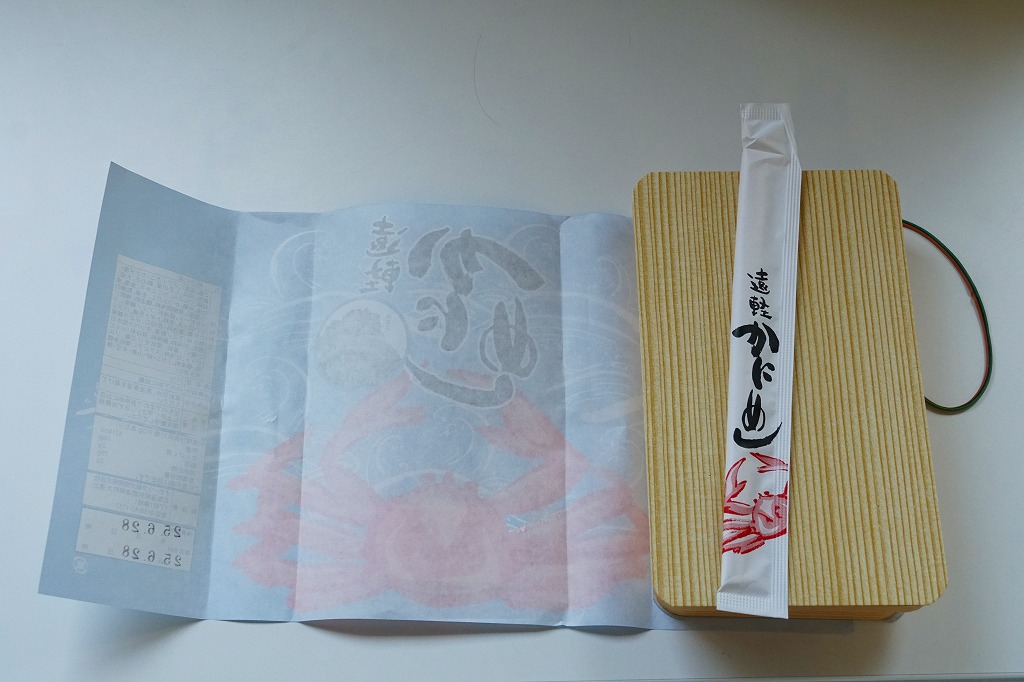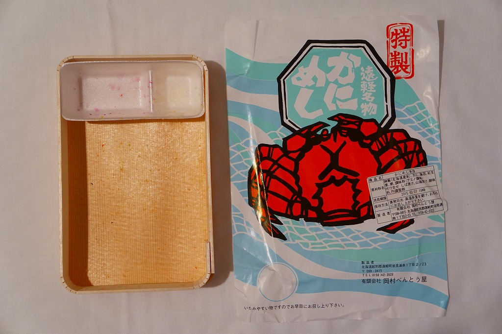 容器に白飯を詰め、カニほぐし身と錦糸卵を載せ、刻み海苔と紅生姜も載せ、カズノコのわさび漬けと柴漬けを添え、カニを描いた青い掛紙で包む姿は、かつての遠軽駅弁「かにめし」に似る。温かい品物が入手できることと、食感の柔らかさも似る。風味は過去の記憶と異なり、味付け飯をカマボコで食べているような感じを受けた。どうもズワイガニのほぐし身にカニかまぼこを混ぜた、あるいはその逆であるようで、かつての駅弁もそうだったのだろうか。