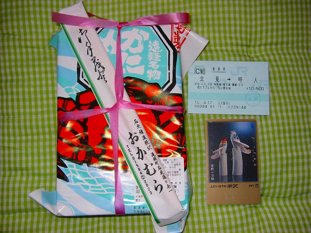 2004(平成16)年4月17日に購入した、昔の遠軽駅弁の掛紙。上記の2015年のものとの違いは、調製元の電話番号のみである。遠軽駅15時17分発の特急列車「オホーツク6号」向けに駅へ売りに来た駅弁を、普通列車の乗り継ぎ待ちの時間で購入した。