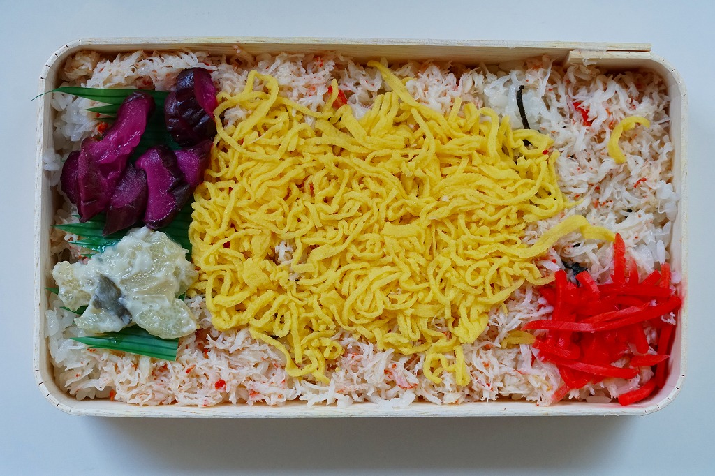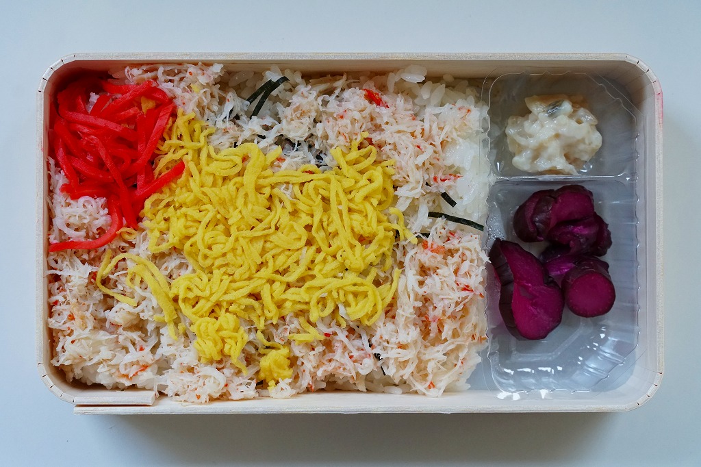 長方形の経木折を、カニを描いた掛紙で包む。中身は御飯の上に細かい炒り卵と紅生姜に刻み、海苔とカニ煮付ほぐし身を混ぜて敷くもの。ツヤのある細かなカニ身から煮汁がきゅっと出て、錦糸卵が食感で、海苔が香りで、紅生姜が刺激で、温かく柔らかい御飯とともに個性を出しながら風味を互いに補いふわりとした食感を出す、好評が納得できる素朴で奥の深いカニ飯駅弁。しば漬と数の子山海煮の添付も的を射ている。