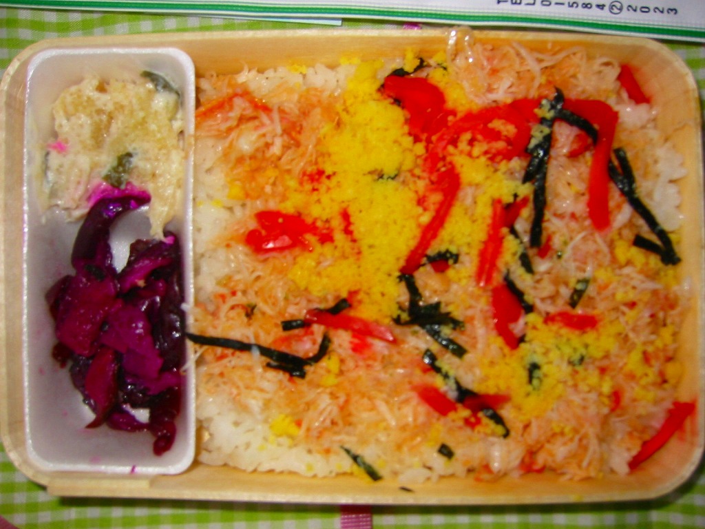 上記の弁当「遠軽かにめし」の「(大盛)」版。ご飯約1.2倍、かに約1.5番増量とする。容器と掛紙は通常版と同じで、内容もまったく同じで、たしかにカニと飯が増量されている。価格は6分の7倍。外観で区別できないので、受け取り時に「大」と手書きした付箋が付いていた。