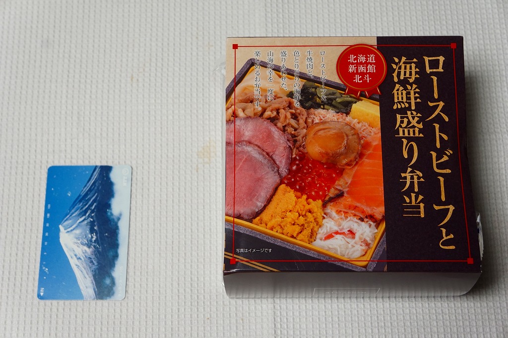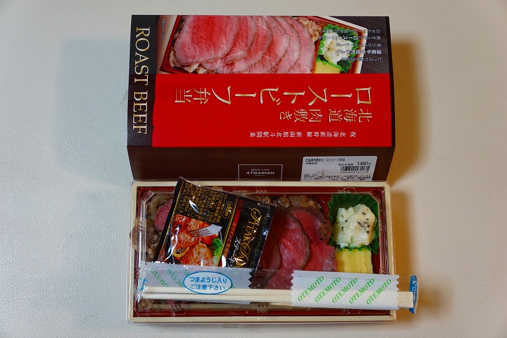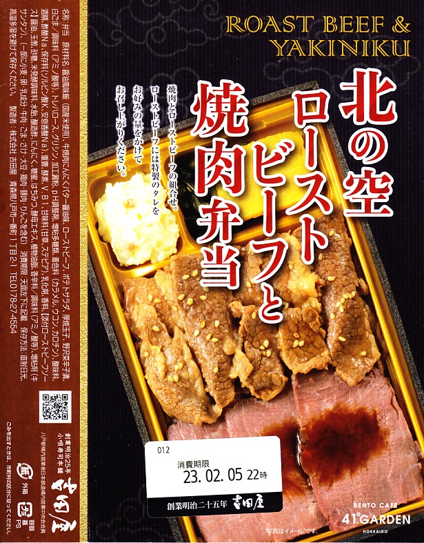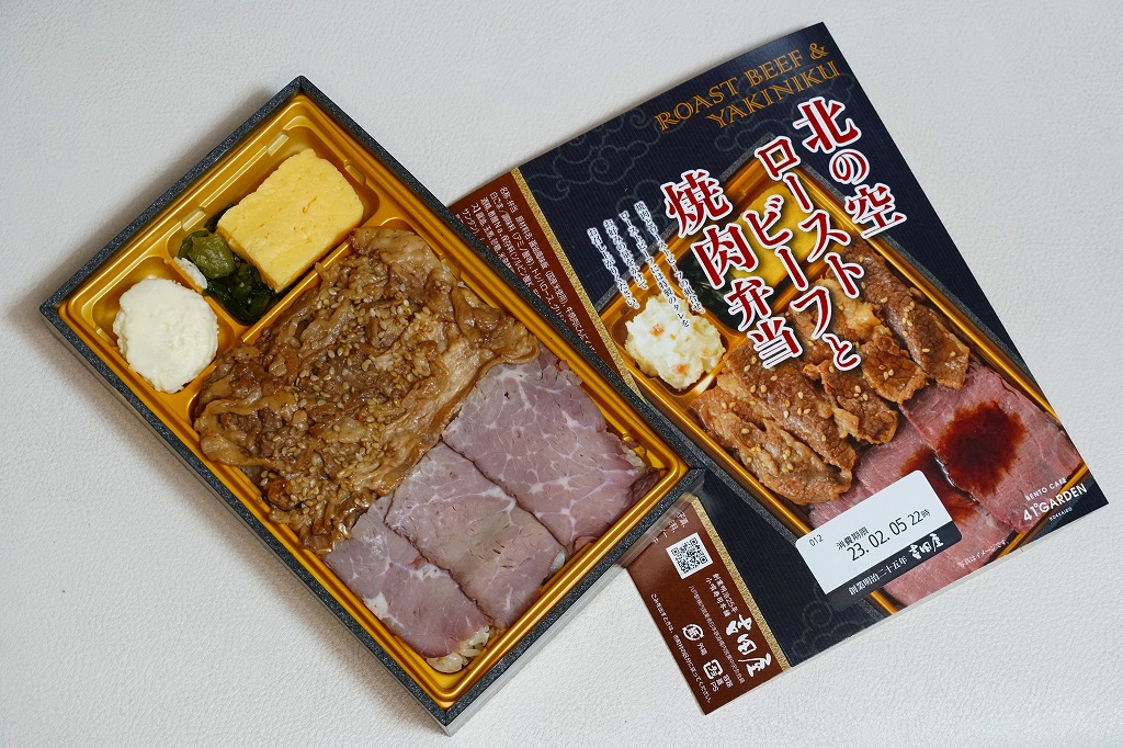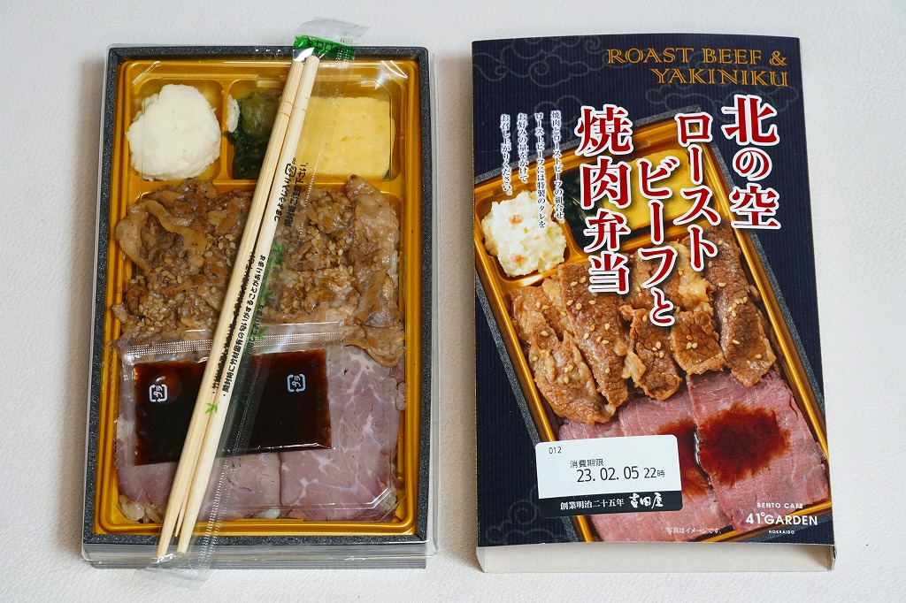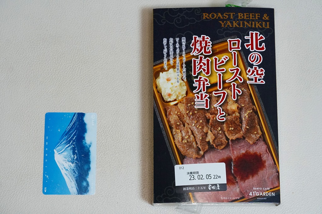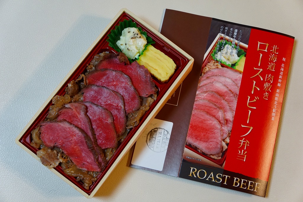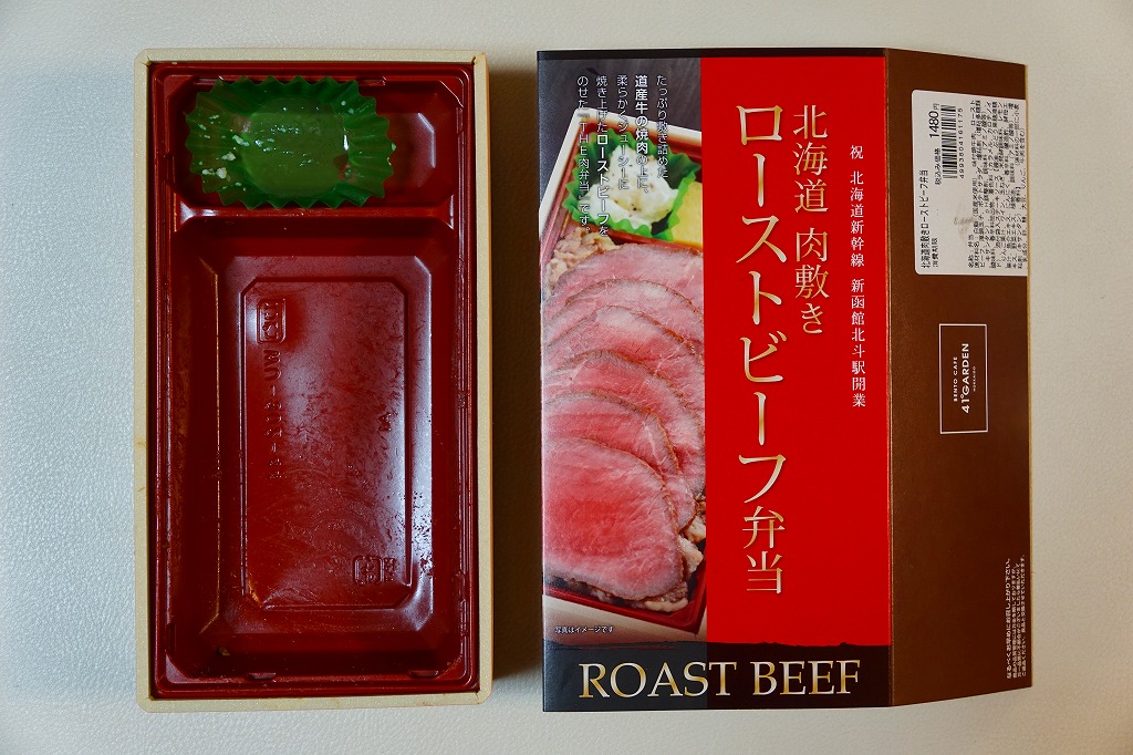 秋冬の駅弁大会シーズンに向けた、2019(令和元)年秋の新商品。長方形の容器に茶飯を敷き、牛焼肉にんにくバター醤油味とローストビーフで半分ずつ覆い、ポテトサラダと玉子焼と野沢菜を添える。「北の空」を除くと、名前どおりのローストビーフと焼肉弁当。函館でなく十勝の帯広あたりにあれば、牛肉とじゃがいもで北海道だと思えたか、勘違いできたかもしれない。主に現地でなく催事で売られる商品か。価格は2020年時点で1,250円、2022年時点で1,300円。2023年3月頃で終売か。