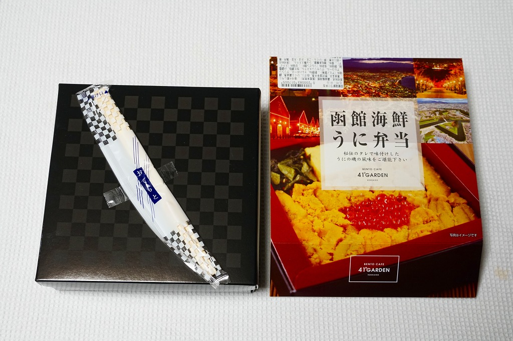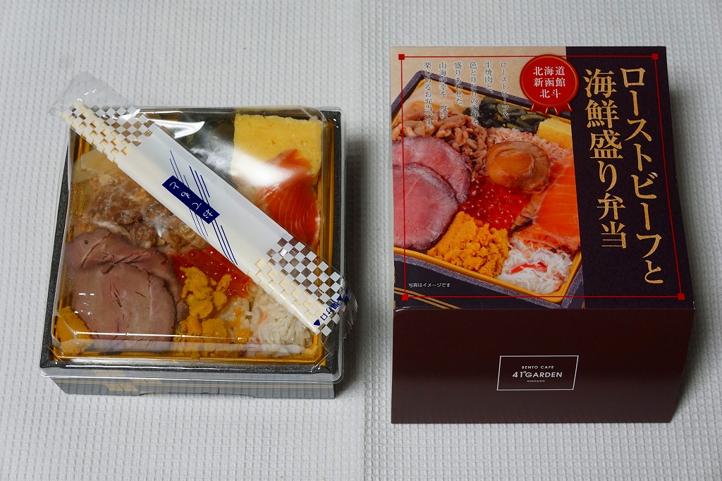 秋冬の駅弁大会シーズンに向けた、2022(令和4)年秋の新商品。長方形の容器に白飯を詰め、黒毛和牛焼肉にんにくバター醤油味とローストビーフを交互に敷き詰め、いくら醤油漬と味付け蒸しウニも交互に置いて、玉子焼とわさび菜を添える。函館とも八戸とも関係がなくても、これはうまそうな魅惑の肉めし。もし駅で買えれば、値は張るけれど、東北・北海道新幹線での移動が豪華になる。調製元は青森県の八戸駅の駅弁屋であり、スリーブにもそう書いてあるものの、同社が新函館北斗駅に出した店「BENTO CAFE 41°GARDEN」表記があるため、新函館北斗駅弁とみなして、ここに収蔵。このシーズンの半年間で終売か。