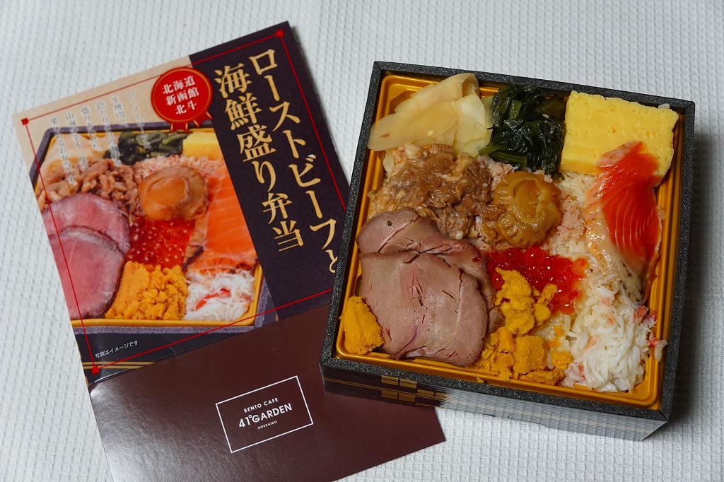 2017(平成29)年秋の新作。スーパーやデパートでの駅弁大会シーズンに向けて、秋は見栄えの良い駅弁の新作がよく出てくる。他の新函館北斗駅弁と同じく、スリーブの上面に駅弁の名前と中身の写真を半分ずつ載せる。中身は駅弁の名前のとおり、茶飯をローストビーフと牛肉煮、玉子焼、野沢菜、ガリ、イクラ、カニほぐし身、ホタテ照焼、蒸しウニ、サーモンで覆うもの。見本の写真に違わない見栄えと、安定した味。このシーズン限り半年間ほどの販売か。