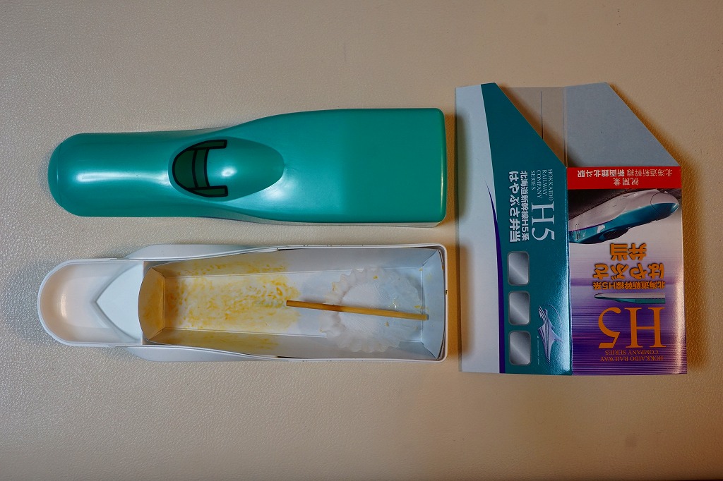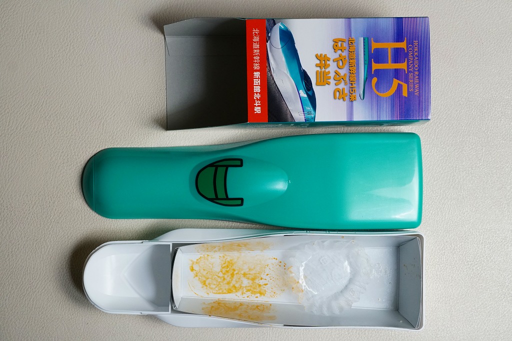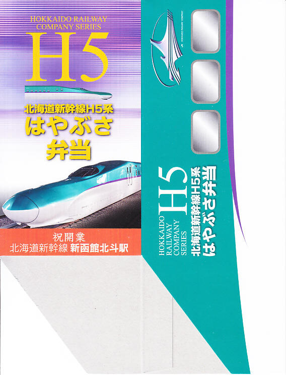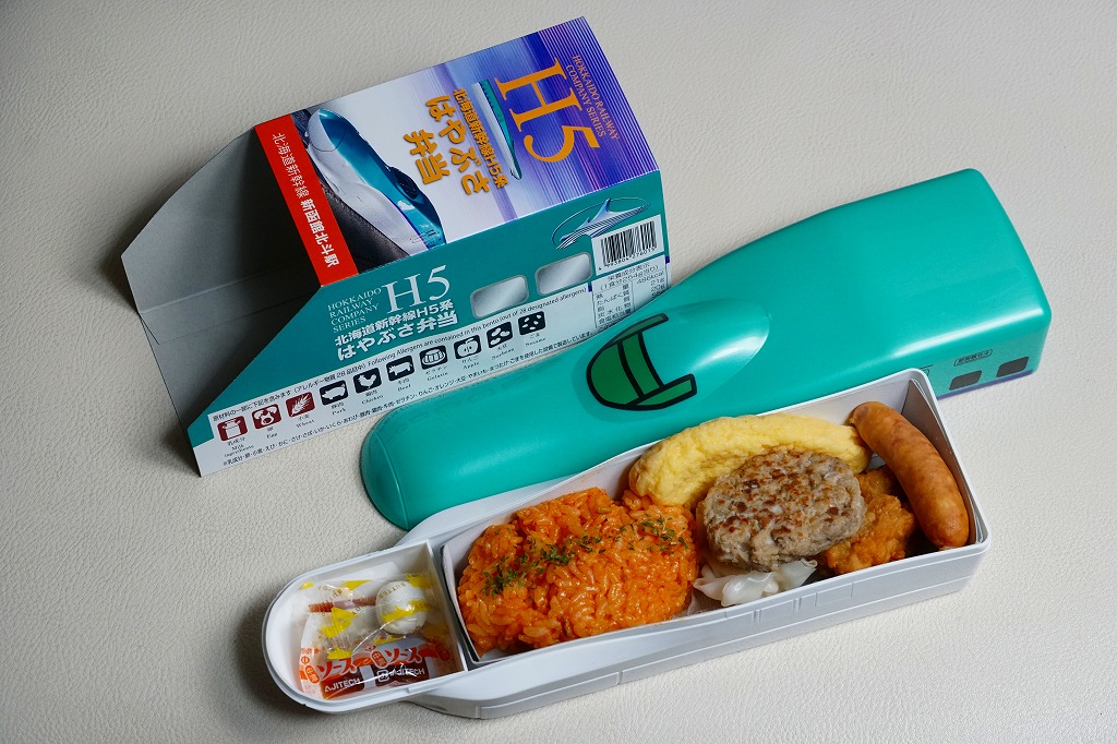 2016(平成28)年1月の京王百貨店の駅弁大会でデビュー、同年3月の北海道新幹線と新函館北斗駅開業に合わせて現地で発売。その名のとおり、北海道新幹線のH5系電車の駅弁。中身は同じ調製元の八戸駅弁「E5系はやぶさ弁当」とほぼ同じで、チキンライスとハンバーグ、オムレツ、からあげ、しゅうまい、ポークソーセージを詰め、バター飴を添えるもの。冷凍食品で中身を固めたなという印象も同じ。元ネタのH5系新幹線電車そのものも、E5系の色違いのようなものなので、これでよい。同じコンセプトの他社製品とは、見た目で同じでも、中身に加えて容器もそれぞれ独自である。価格は2016年の発売時や購入時で1,250円、2020年時点で1,300円、2023年時点で1,380円、2025年時点で1,580円。