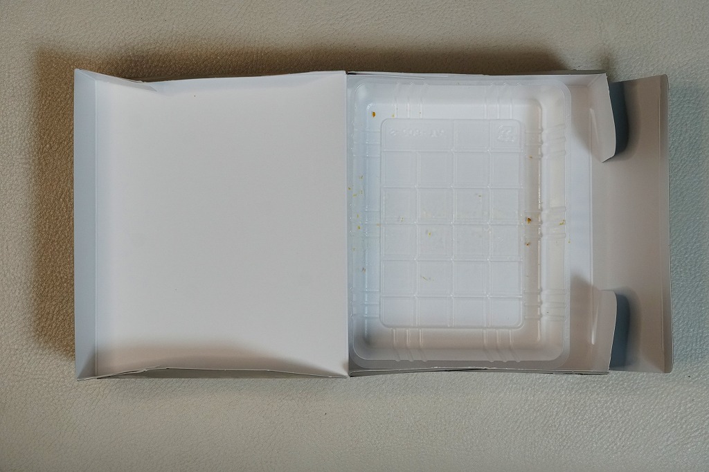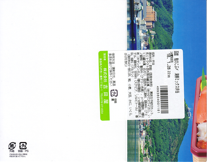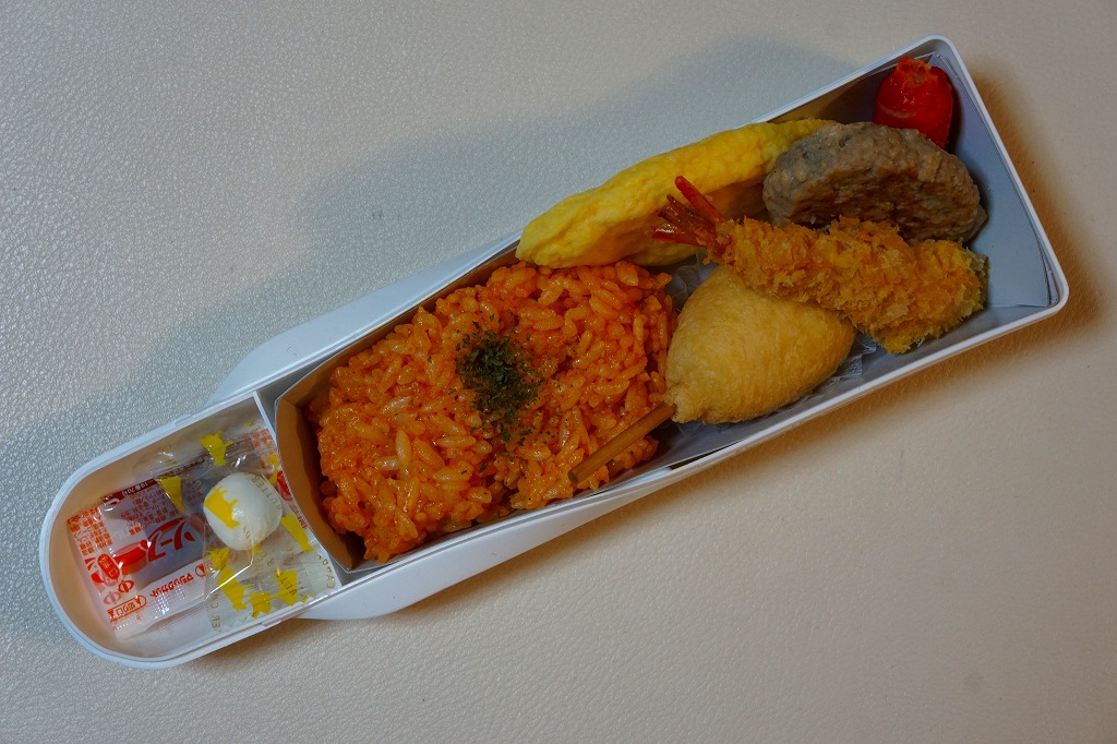 上記の駅弁「北海道新幹線H5系はやぶさ弁当」の、2016(平成28)年の発売時の姿。上記の2025年のものと、おおむね変わらない。当時はスリーブに食品表示やアレルギー表示がなく、「祝開業」の文字があり、中身はケチャップライスとアメリカンドック、ミニオムレツ、ハンバーグ、エビフライ、フライドポテト、ウインナーを詰め、ミルク飴を添えるものであり、弁当の現物では調製元が分からなかった。