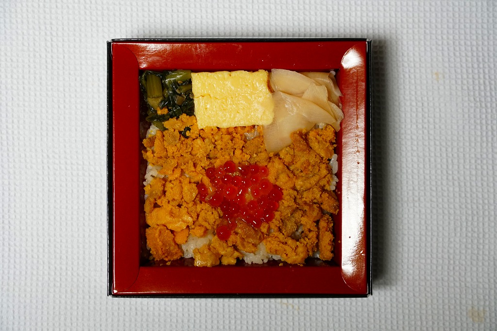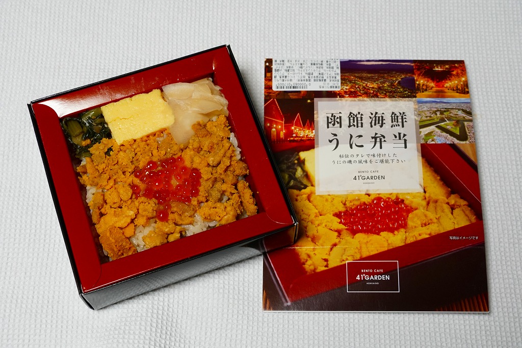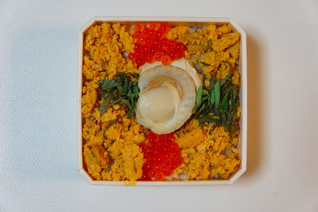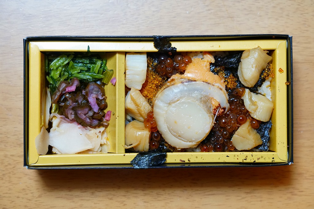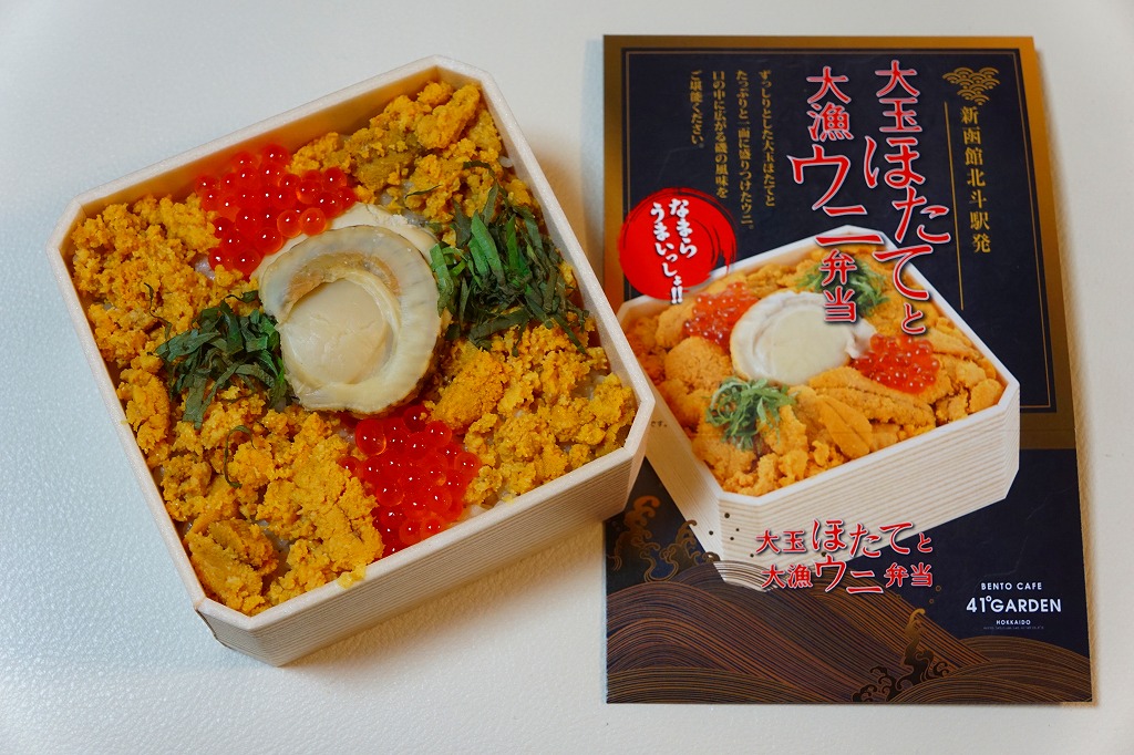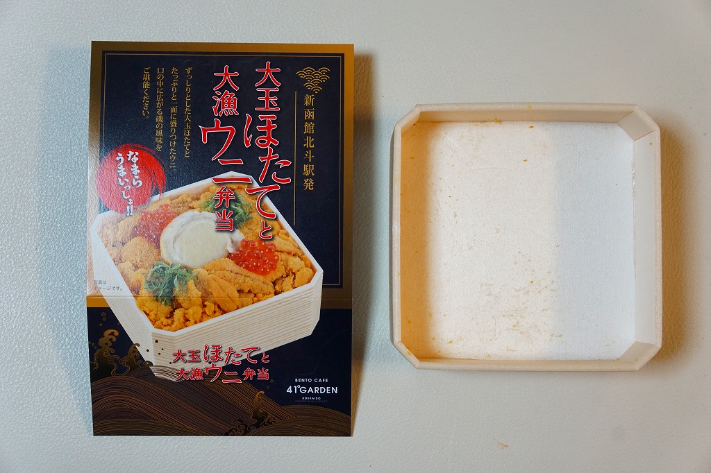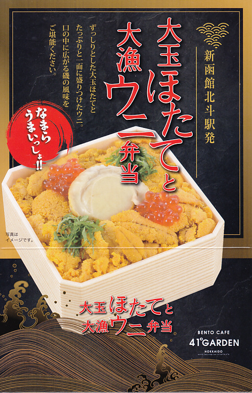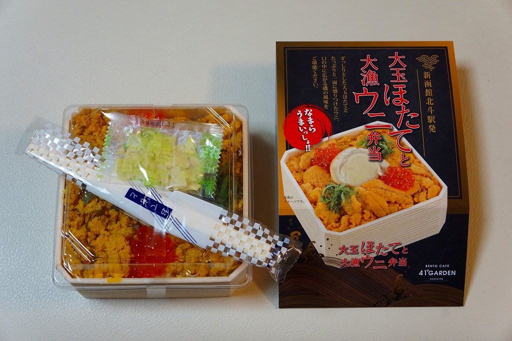 四角い容器に茶飯を敷き、パッケージの見本写真のとおり、蒸しウニとイクラ醤油漬けと、大きな蒸しホタテ1個で覆い、大葉で彩る。今回はその駅弁大会で購入。今までの函館の駅弁にない高価で、特大サイズで肉厚のホタテと、あふれんばかりのウニの使用が特徴だというが、イクラはともかくホタテ、ウニ、大葉は乾燥してボロボロになっており、催事場での大量製造品でない現地のものを味わう必要があると思った。この現物では分からないが、調製元と上記の駅弁売店の運営者は、八戸駅弁の吉田屋。2018年までの販売か。