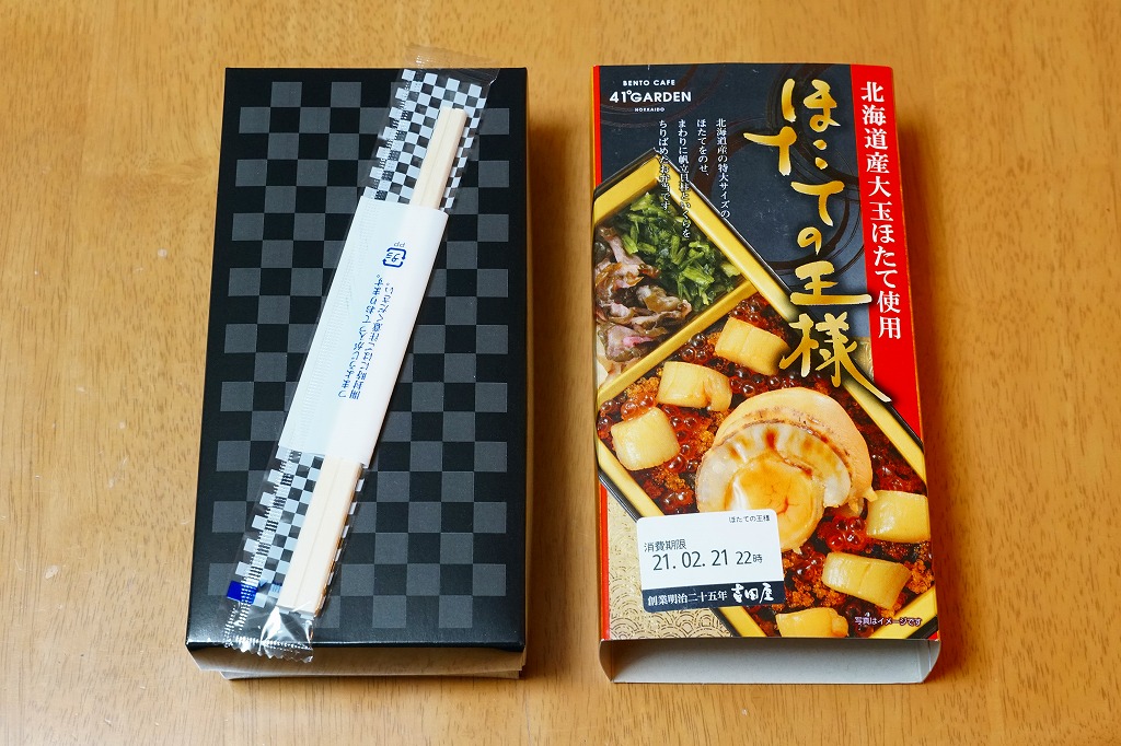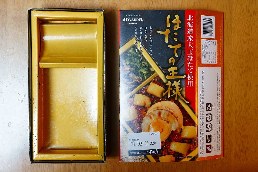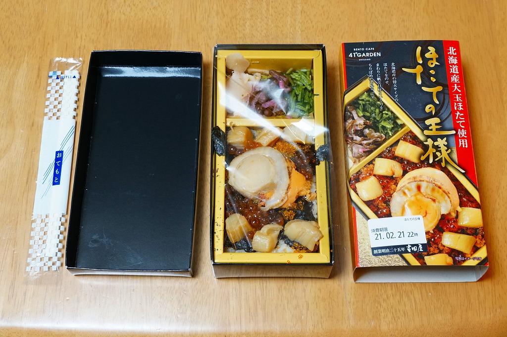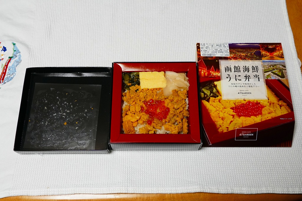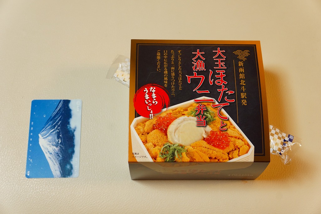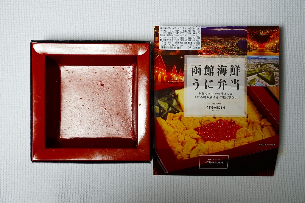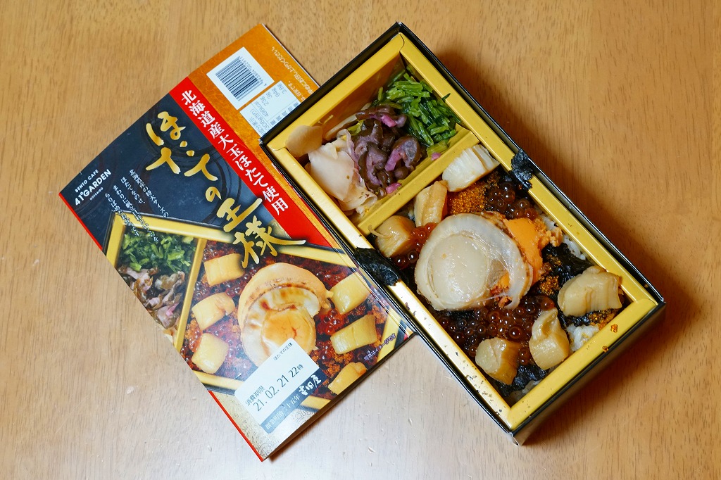 四角い容器に茶飯を敷き、パッケージの見本写真のとおり、蒸しウニとイクラ醤油漬けと、大きな蒸しホタテ1個で覆い、大葉で彩る。今回はその駅弁大会で購入。今までの函館の駅弁にない高価で、特大サイズで肉厚のホタテと、あふれんばかりのウニの使用が特徴だというが、イクラはともかくホタテ、ウニ、大葉は乾燥してボロボロになっており、催事場での大量製造品でない現地のものを味わう必要があると思った。この現物では分からないが、調製元と上記の駅弁売店の運営者は、八戸駅弁の吉田屋。2018年までの販売か。