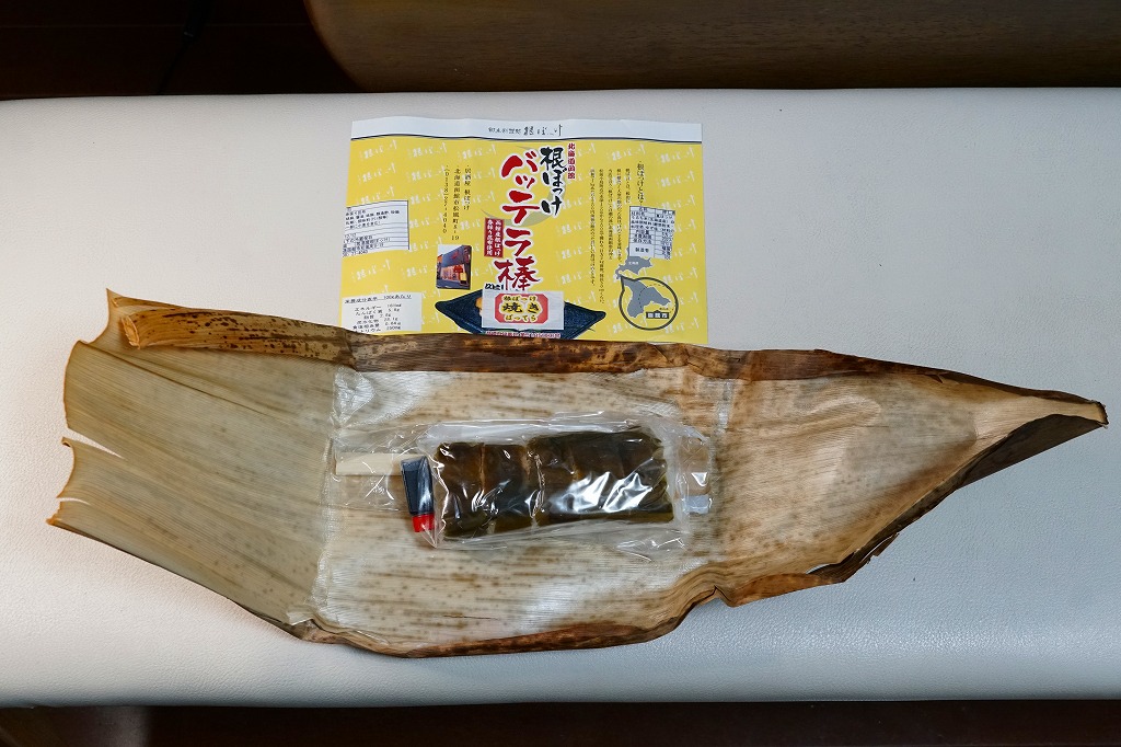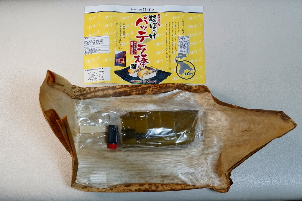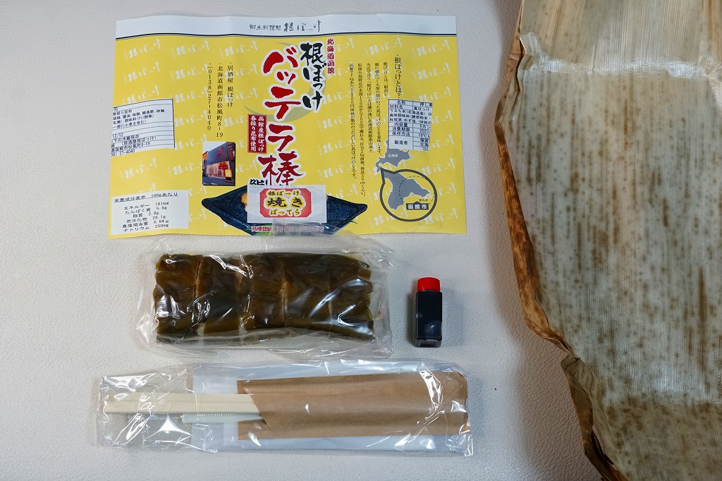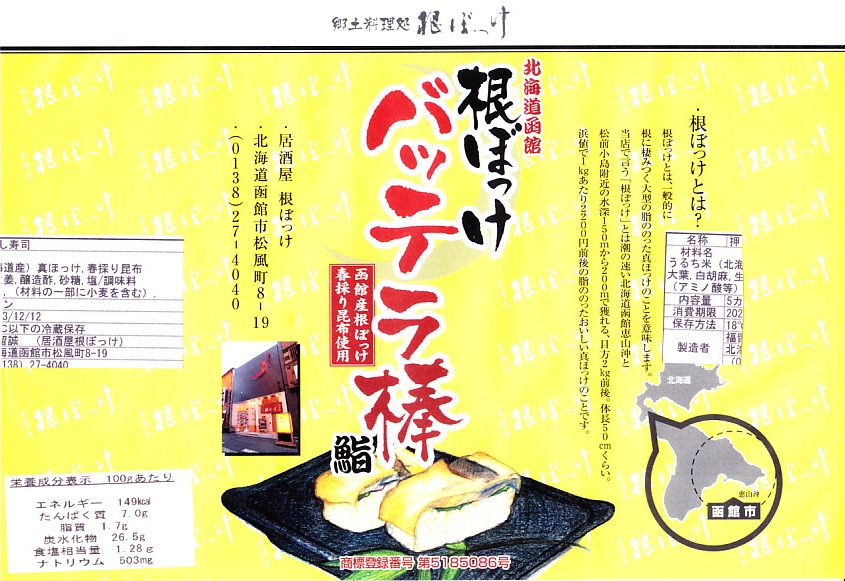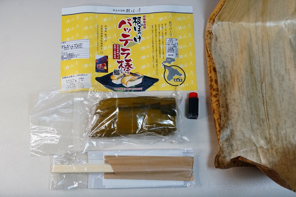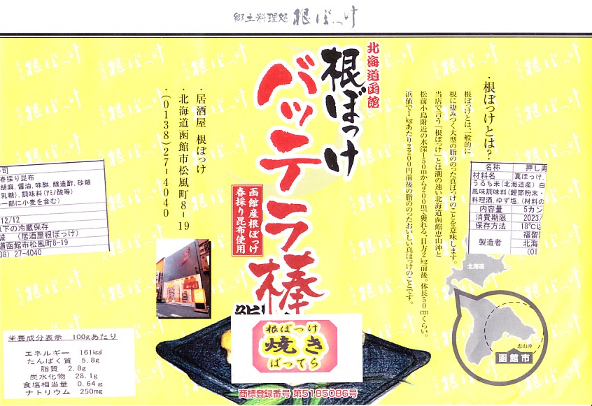 新函館北斗駅で駅弁が買えるキヨスクで、駅弁と一緒に売られていた棒寿司。上記の商品「根ぼっけバッテラ棒鮨」の、掛紙に「根ぼっけ焼きばってら」とあるシールを貼り、中身のうち真ほっけが焼いたものになっている。値段を含め、それ以外は変わらない。味もあまり変わらないが、身の固さで食感は異なる。