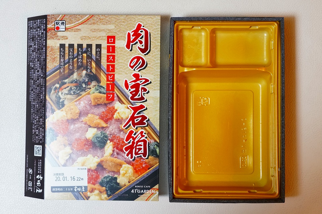 秋冬の駅弁大会シーズンに向けた、2019(令和元)年秋の新商品か。内容や宣伝文は、スリーブに写真付きでしっかり書かれており、「ローストビーフの上に、うに、いくらをちりばめた宝石のようなちらし寿司です。」ということで、酢飯の上にローストビーフ、蒸しウニ、スクランブルエッグ、いくら醤油漬、わさび菜をちりばめて、タケノコと野沢菜のおひたしと柴漬けを添える。きらびやかな、例えば小樽駅弁「海の輝き」のような見栄えのちらし寿司を、ローストビーフで作った不思議な味。2シーズンを売り、2021年の春頃に終売か。
