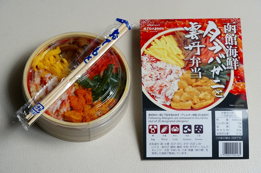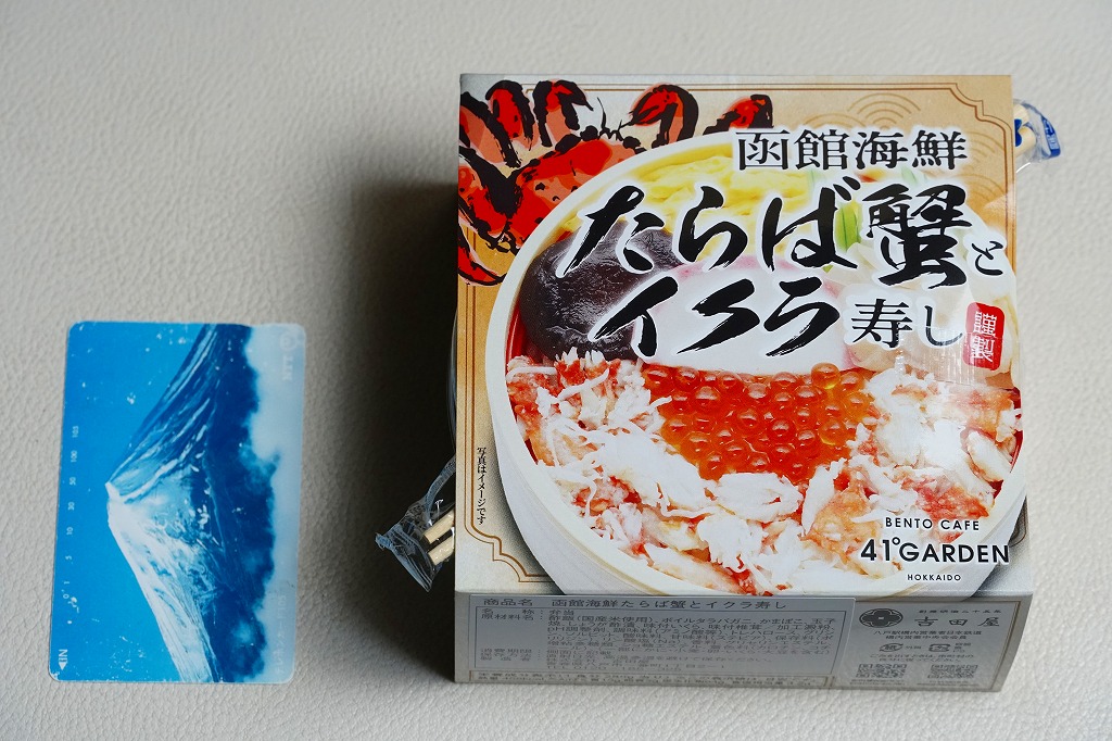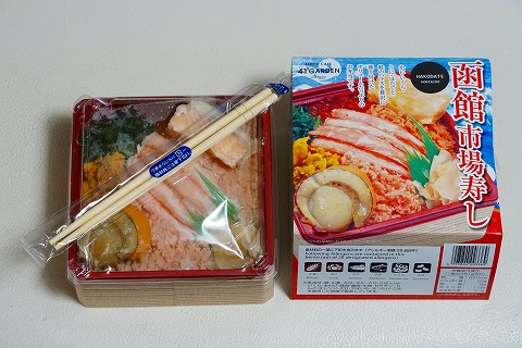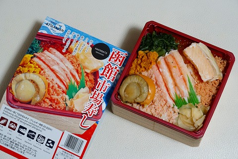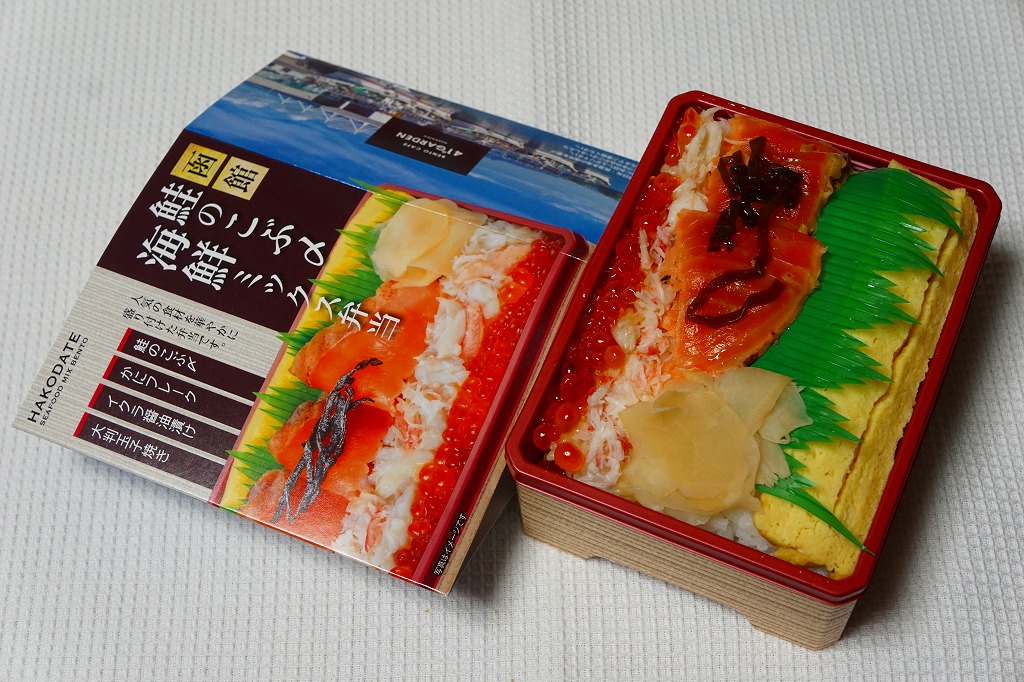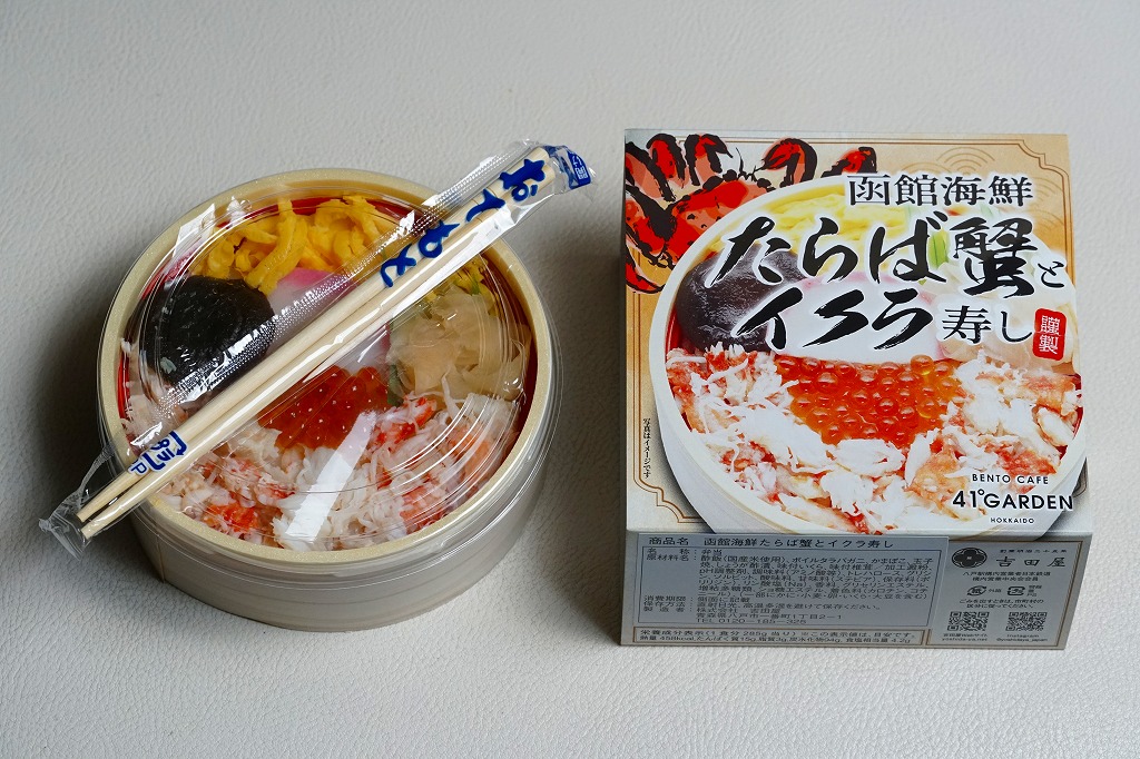 中身の写真を美しく載せたスリーブにはめた、やや上げ底で正方形のプラ容器に、酢飯を詰め、鮭フレーク、かにフレーク、蒸しうに、わさび菜、イクラ、ガリで覆い、ホタテ煮、サーモンハラス焼き、カニ脚肉を並べる。内容では典型的な北海道を名乗る海鮮弁当を、常温でも持ち運べる駅弁の体にした感じで、そんな需要があれば向きそう。スリーブの宣伝文からもたぶん、函館駅前の市場とは関係ない。価格は2022年時点で1,580円、2023年時点で1,680円、2025年時点で1,800円。