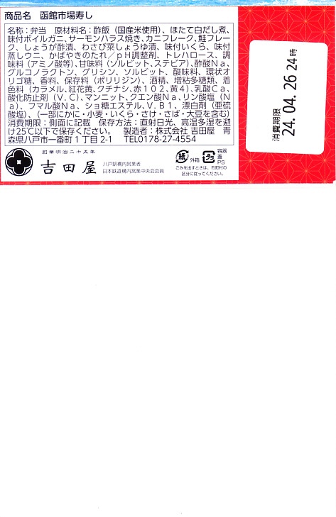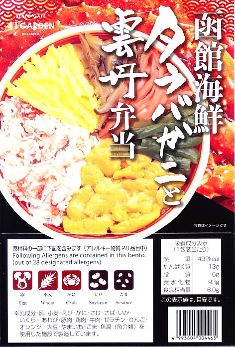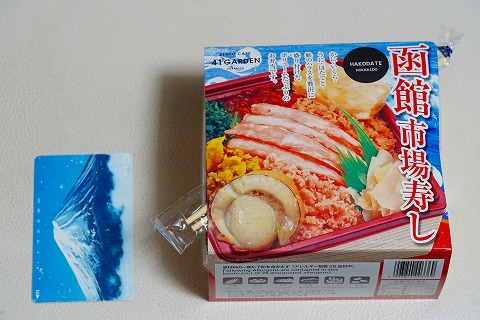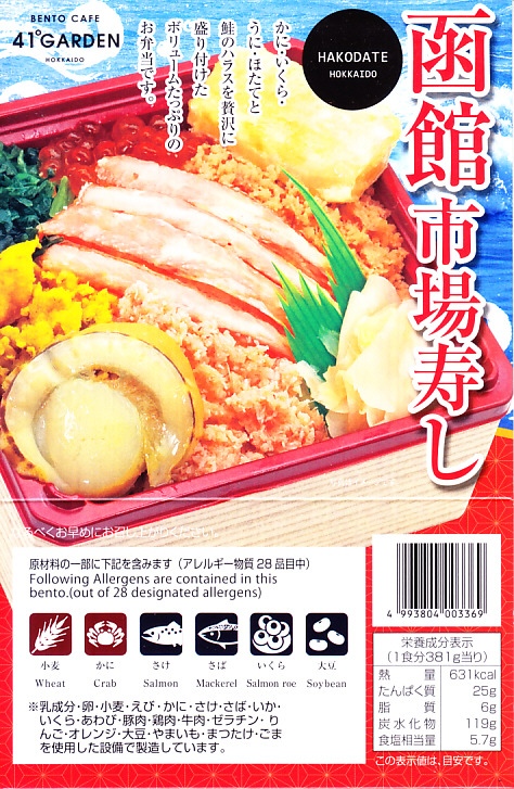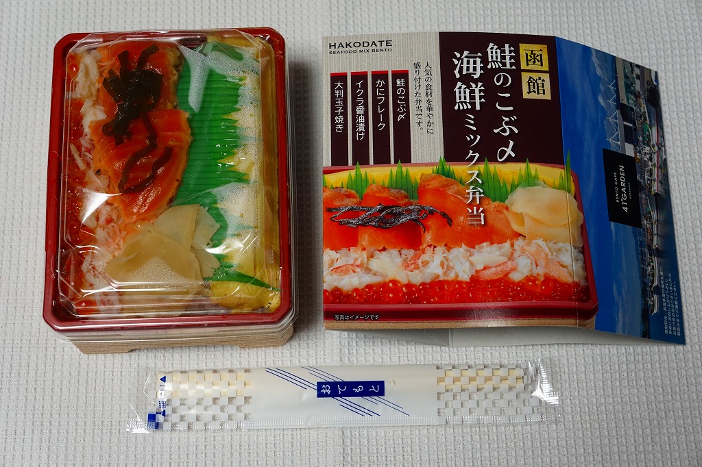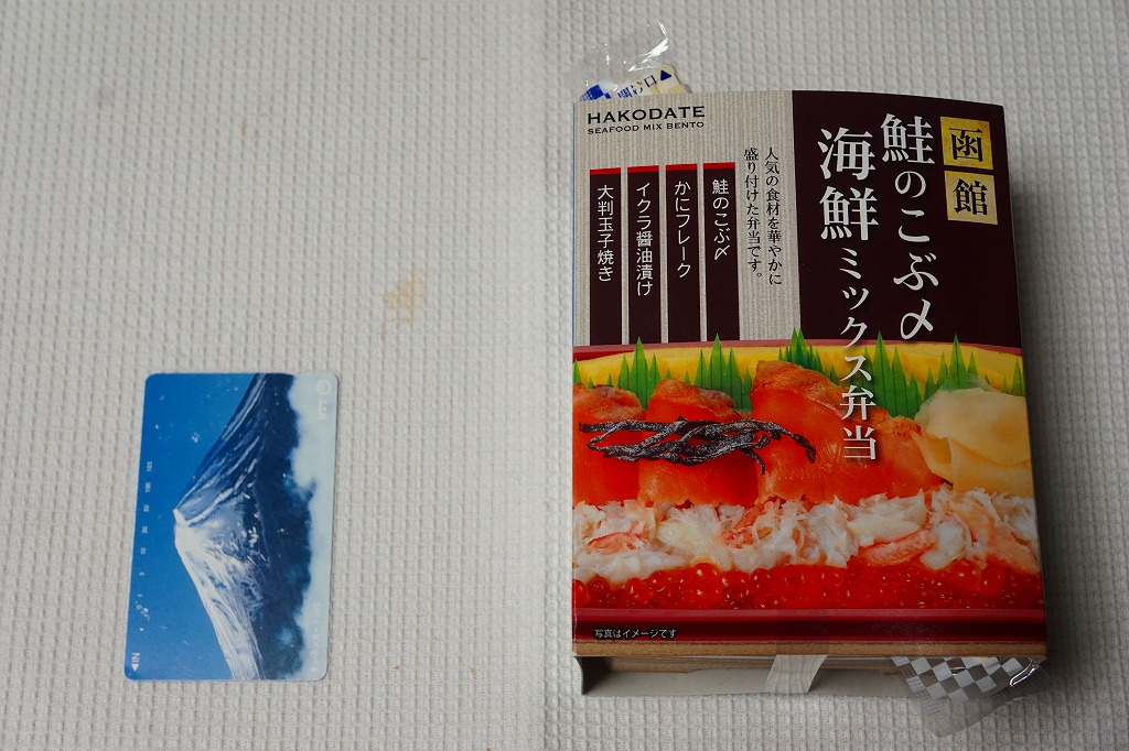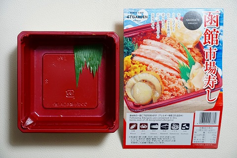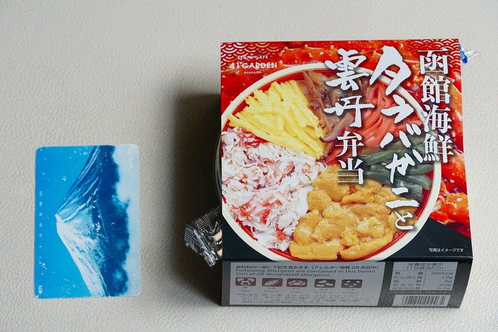 中身の写真を美しく載せたスリーブにはめた、やや上げ底で正方形のプラ容器に、酢飯を詰め、鮭フレーク、かにフレーク、蒸しうに、わさび菜、イクラ、ガリで覆い、ホタテ煮、サーモンハラス焼き、カニ脚肉を並べる。内容では典型的な北海道を名乗る海鮮弁当を、常温でも持ち運べる駅弁の体にした感じで、そんな需要があれば向きそう。スリーブの宣伝文からもたぶん、函館駅前の市場とは関係ない。価格は2022年時点で1,580円、2023年時点で1,680円、2025年時点で1,800円。