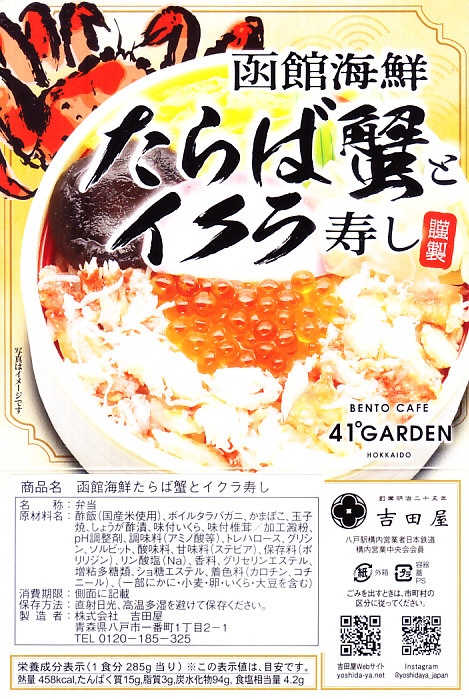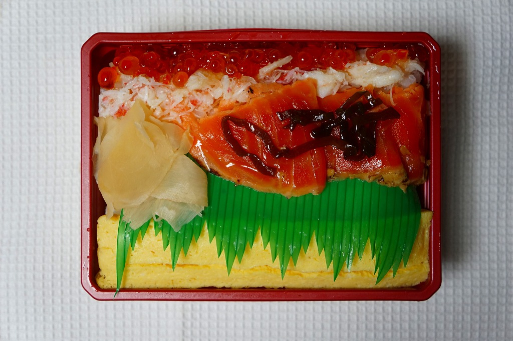 秋冬の駅弁大会シーズンに向けた、2017(平成29)年秋の新作。スーパーやデパートでの駅弁大会シーズンに向けて、秋は見栄えの良い駅弁の新作がよく出てくる。他の新函館北斗駅弁と同じく、スリーブの上面に駅弁の名前と中身の写真を半分ずつ載せる。中身は酢飯の上に玉子焼、サーモンのような鮭のこぶ〆、ガリ、カニほぐし身、イクラを並べるもの。見本の写真に違わない見栄えと、安定した味。現地で売られたかは不詳。翌年のシーズンを待たずに終売か。