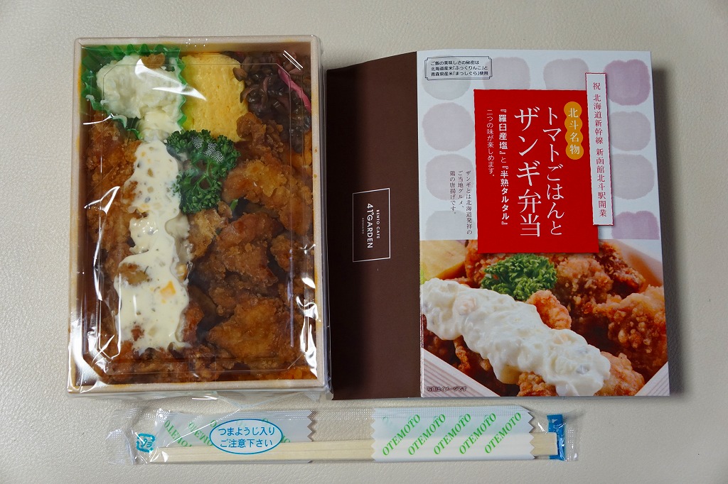2016(平成28)年の夏までに発売か。「ザンギ」とは、唐揚げの北海道内での呼び名。駅弁の名前のとおり、長方形の容器にトマトごはんを敷き詰め、ザンギなる鶏唐揚でほぼ覆い、タルタルソースをかけてパセリで彩り、ポテトサラダ、玉子焼、柴漬けを添える。中身は少し異なるが東京駅の名物駅弁「チキン弁当」を思わせる、水っぽい飯とざらついた鶏唐揚が、見た目も発売時期も新しい駅弁なのに昔懐かしい感じ。発売翌年の京王百貨店の駅弁大会での輸送販売では大人気で、開店時でもなかなか買えなかった模様。2018年8月頃に終売。