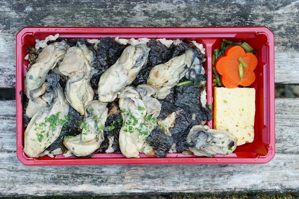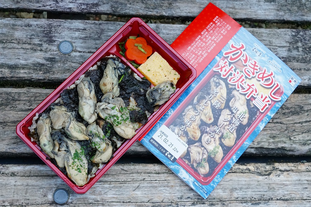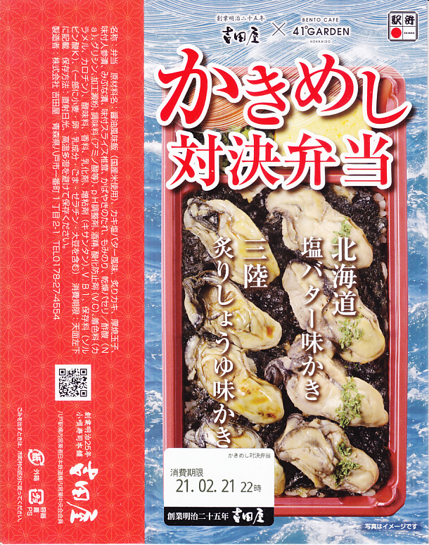 秋冬の駅弁大会シーズンに向けた、2020(令和2)年秋の新商品か。茶飯を海苔で覆い、カキ煮を8個並べ、玉子焼とニンジンとみぶな漬を添える。カキはスリーブの写真と文字にあるとおり、左側の1列4個を吉田屋の三陸炙りしょうゆ味、右側の1列4個を41°GARDENの北海道塩バター味として、対決弁当とする。八戸駅と新函館北斗駅で駅弁を売る調製元の自社対決でもある。食べて確かに、醤油味とバター味を区別でき、海苔も加えて香りの強い弁当。価格は2021年時点で1,250円、2024年時点で1,380円、2025年時点で1,450円。