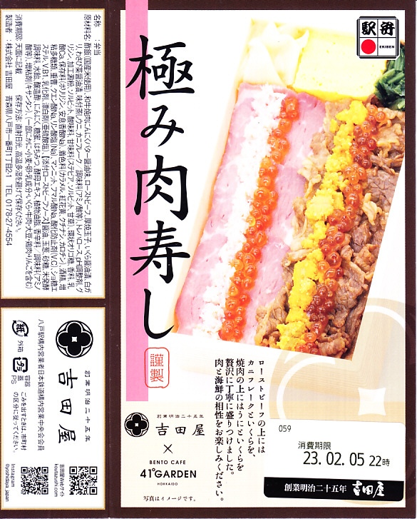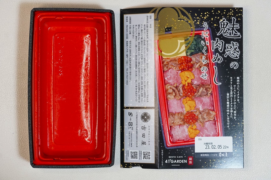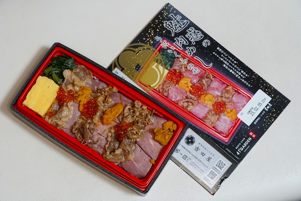 2023(令和5)年の1月までに、催事での輸送販売で発売か。長方形の容器に酢飯を敷き詰め、和牛焼肉にんにくバター醤油味とローストビーフで半分ずつ覆い、いくら醤油漬2列と味付蒸しウニ1列で彩り、玉子焼、わさび菜、ガリを添える。お肉たっぷり、ウニとイクラとタレで味と風味もたっぷり。御飯の酸味がマイナスにならない、見た目も味も肉寿司の創作。値が張るだけ、お肉そのものもおいしかった。秋冬の駅弁大会シーズンが終わる3月までに終売か。