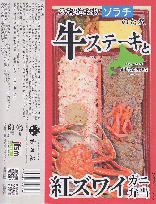 2025(令和7)年の5月までに各地で発売か。長方形のプラ容器に茶飯を詰め、1列を牛ステーキで覆い紅生姜を載せ、1列をベニズワイガニのほぐし身で覆いカニ味噌を載せ、きんぽらごぼう、茎わかめお、玉子焼きを添える。スリーブの文字によると、牛肉の味付けに「北海道名物ソラチのたれ」、ジンギスカンや豚丼のタレで知られる北海道芦別の調味料製造業「ソラチ」の製品を使ったのだろうか。甘めでサラサラな触感だった。価格は2025年の購入時で1,480円、秋の時点で1,600円。