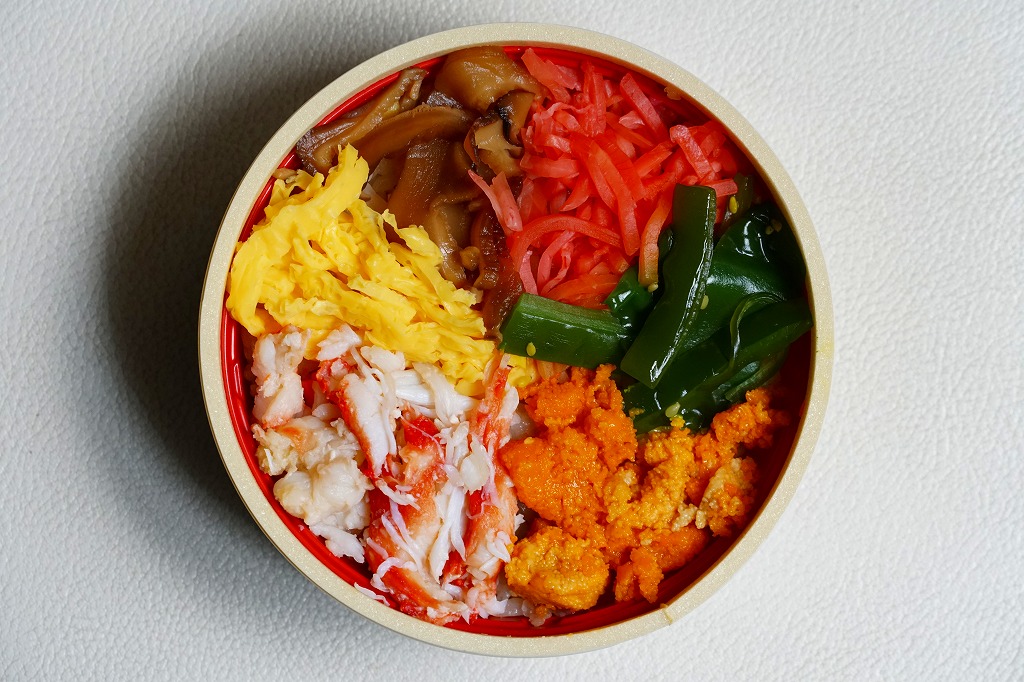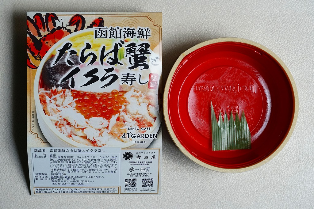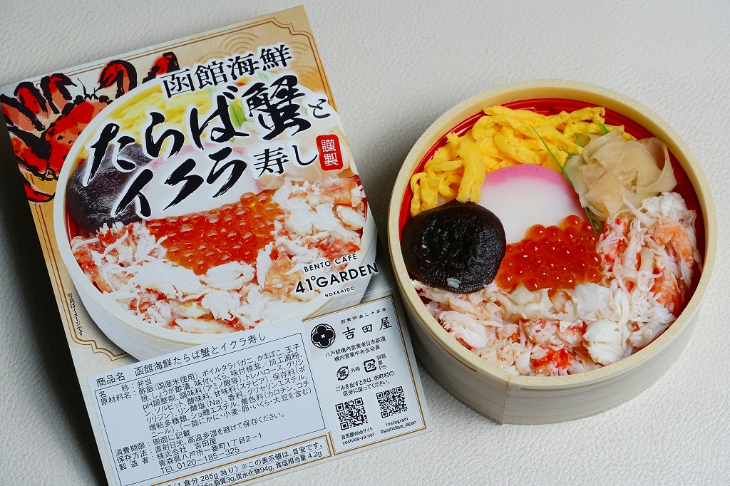 秋冬の駅弁大会シーズンに向けた、2023(令和5)年秋の新商品。どうもスーパーやデパートの駅弁催事に出てきていない、めったに売られないお弁当である模様。丸いプラ容器に酢飯を詰め、たらばがにと錦糸卵で覆い、しいたけ、かまぼこ、甘酢生姜、イクラを載せる。酢飯の酢の弱さと柔らかい玉子焼の助けで、カニとイクラを味わえたと思う。なお、タラバガニは函館朝市でも買ったり食べたりできるが、通常は函館港でのタラバガニの水揚げは無いという。