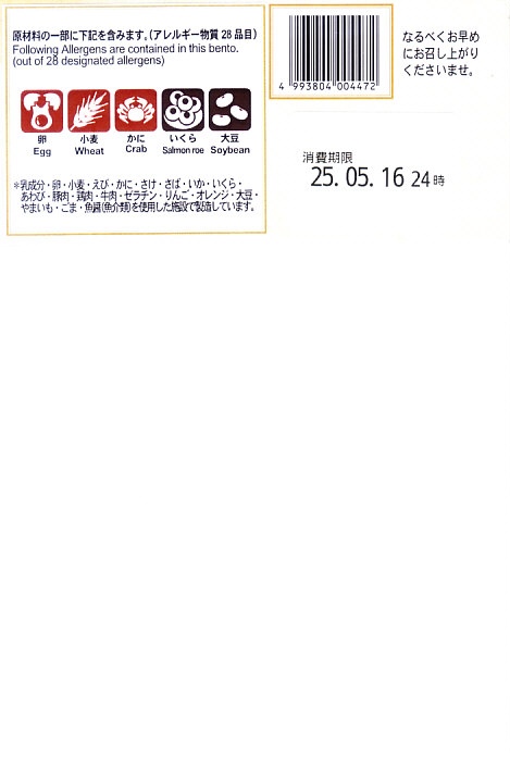 秋冬の駅弁大会シーズンに向けた、2023(令和5)年秋の新商品。どうもスーパーやデパートの駅弁催事に出てきていない、めったに売られないお弁当である模様。丸いプラ容器に茶飯を詰め、たらばがに、蒸しうに、錦糸卵、しいたけ、茎わかめ、紅生姜で覆う。スリーブの写真のとおり、商品名やその表記でのイメージと違い、具のうちカニは2割、ウニを入れても4割ほど。味と香りと量での主役が紅生姜になってしまい、それらの上記の具で飯を食べ進めなければならず、海鮮っぽくなかった。