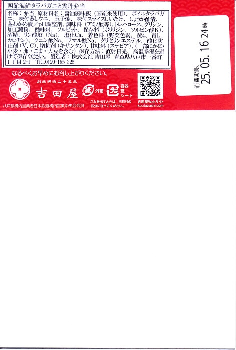 2016年の購入時に現物へ記されなかった調製元は、北海道でなく青森県の、八戸駅の駅弁屋である吉田屋。これは疑義でもなんでもなく、実際に新函館北斗駅の開業に合わせて改札外に店舗を構えた。駅所在地の北斗市の要請と、創業者が現在の北斗市内の出身であることで、駅弁屋が海峡を越えた。函館駅弁の「函館みかど」の北海道キヨスクも改札内、ホーム上、改札外の3箇所に店舗を構えたため、駅弁屋2社が競争する駅となっている。