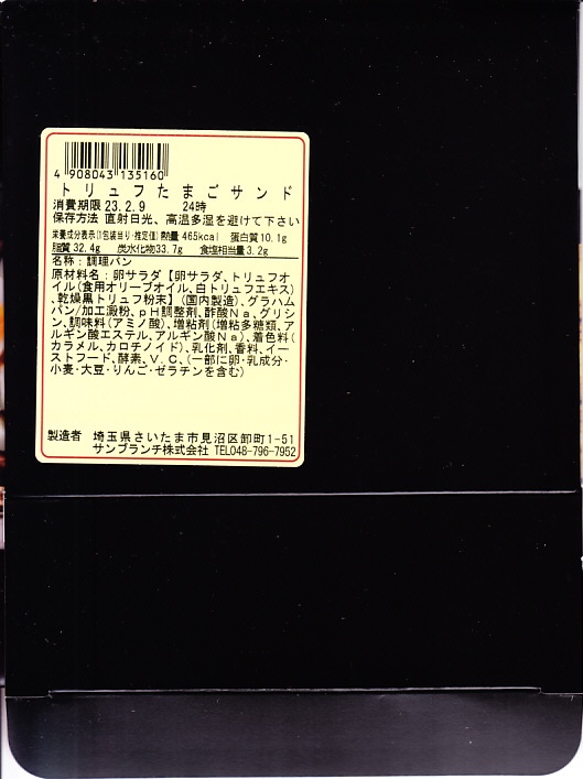 食品表示での商品名は「トリュフたまごサンド」。2023(令和5)年1月までに、東京駅や駅弁催事などで発売か。トリュフのオイルとエキスと粉末を混ぜた卵サラダを、グラハム粉を使う茶色い耳なし食パンで挟んだサンドイッチを3切れ、半透明のプラ製トレーに収めて透明な袋で密封し、商品名と具材などを描いた黒い紙箱に収める。食べればただのたまごサンドに思えてしまい、どうすればトリュフの味や香りを感じ取れるか。紙箱に「41°GARDEN」「HOKKAIDO」とあるため、ここでは新函館北斗駅の駅弁とみなすが、製造者は埼玉県さいたま市の食品工場であった。