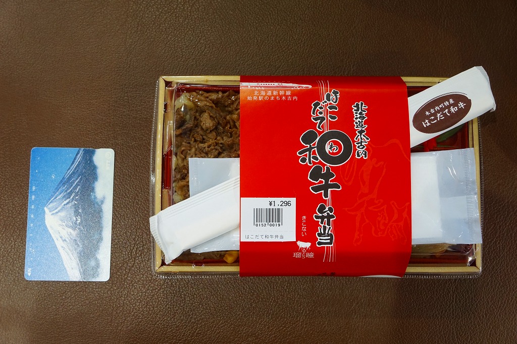 道の駅の弁当であるが、掛紙には新幹線電車の側面図と「北海道新幹線始発駅のまち木古内」の文字がある。中身は白御飯を二色の「はこだて和牛」の牛肉煮で覆い、ソーセージ、コーン、きんぴらごぼう、紅生姜を添えるもの。味付けの甘さで、肉の味が飛んでしまった感があるが、見た目と機能は駅弁そのもの。価格は2016年の発売時や購入時で1,296円、2019年10月の消費税率改定で1,320円、2023年時点で1,200円だという。