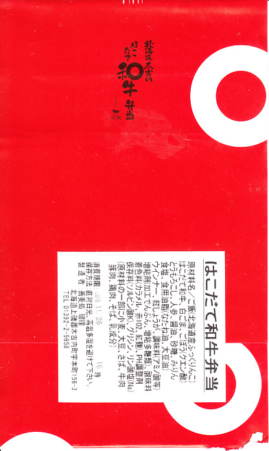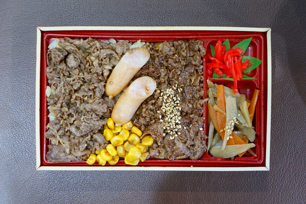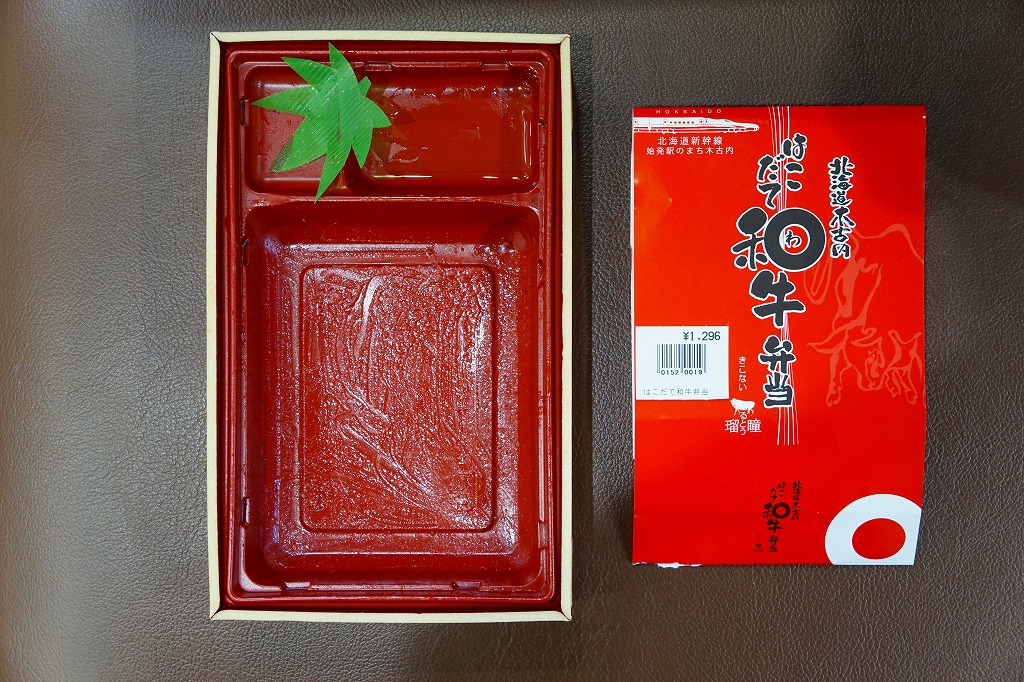 はこだて和牛とは、函館市内ではなく木古内町内で1990年代から使われる、同町内で生産するあか牛(褐毛和牛)のブランド名。脂肪でなく赤身の柔らかさとうまさが特徴。特段の宣伝も拡販もなく、地元で作られて食べられる。木古内駅近くのそば屋「蕎麦処 瑠瞳(るとう)」では、和牛御膳、和牛バーガー、和牛弁当のメニューを取りそろえ、そのひとつがこの弁当である。