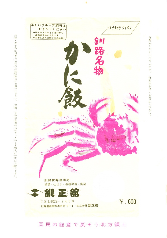 1985(昭和60)年10月7日の調製と思われる、昔の釧路駅弁の掛紙。絵柄は上記の現在のものと変わらない。絵柄でない注意書きやスローガンに調製元の名前は変化した。