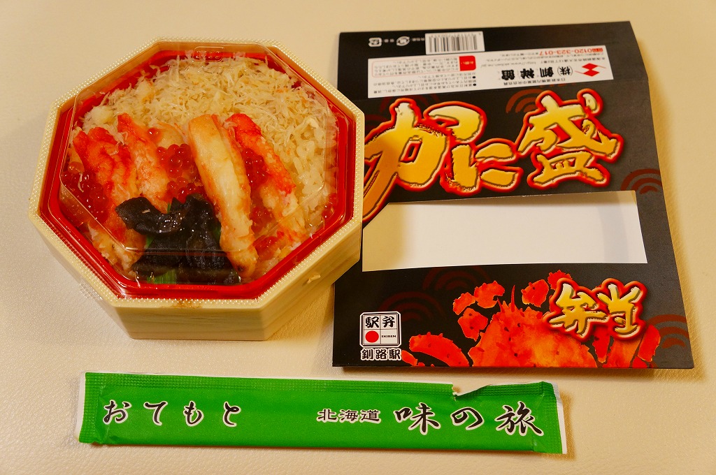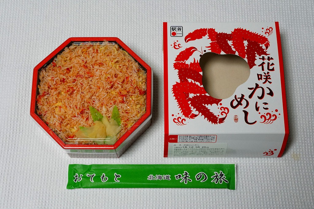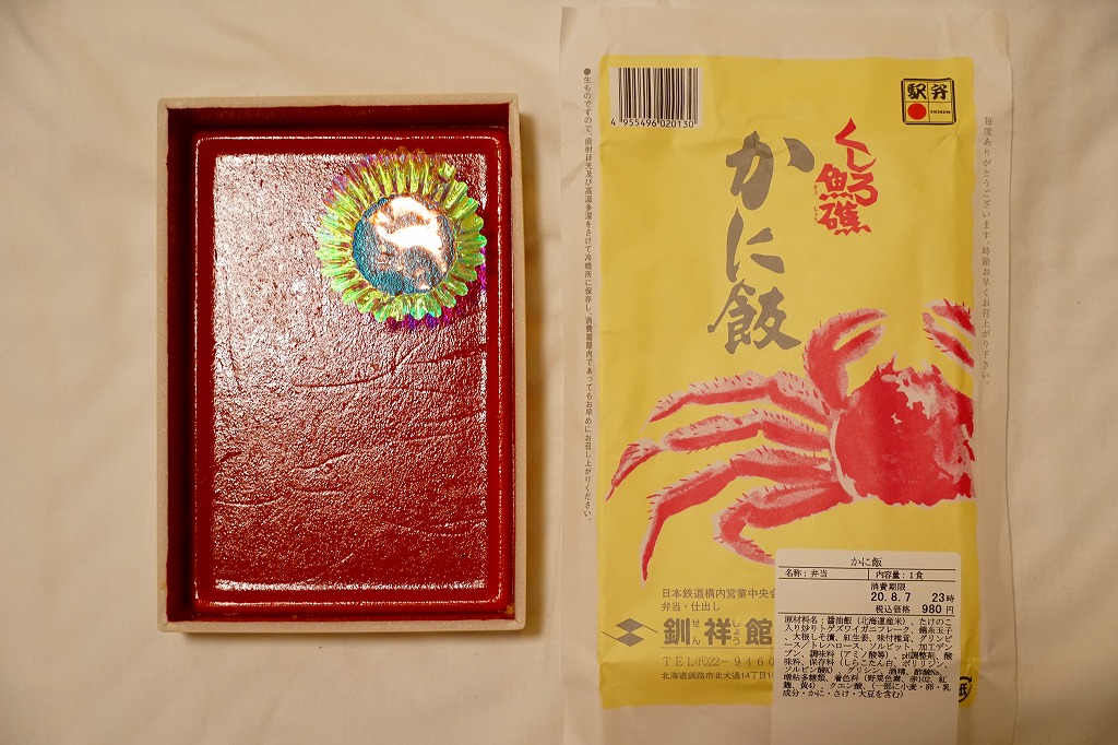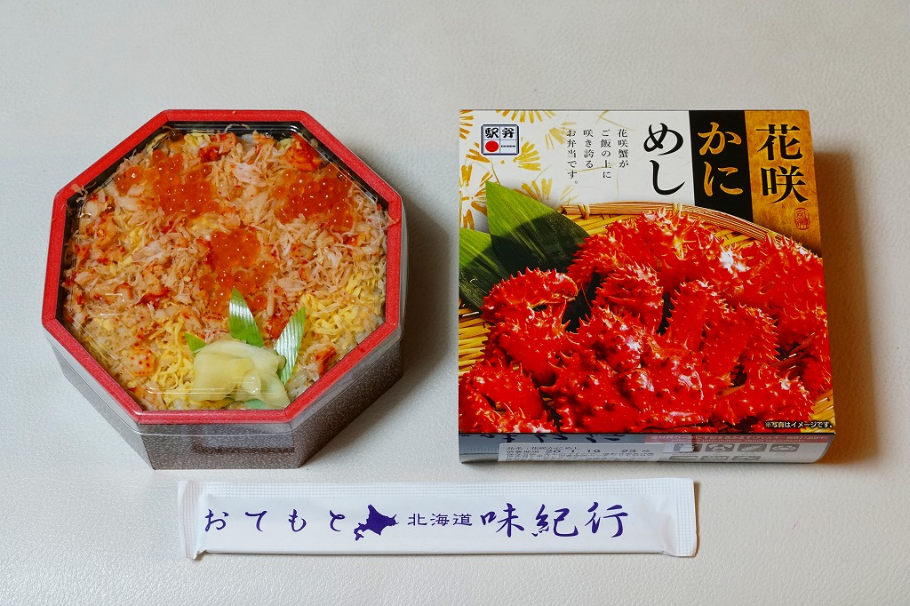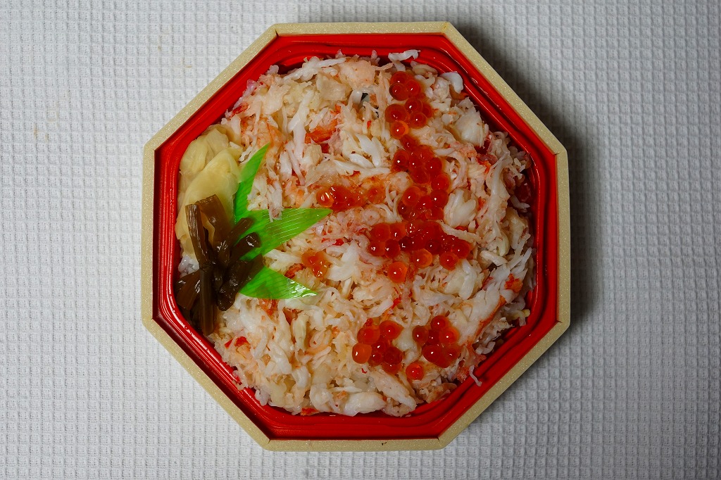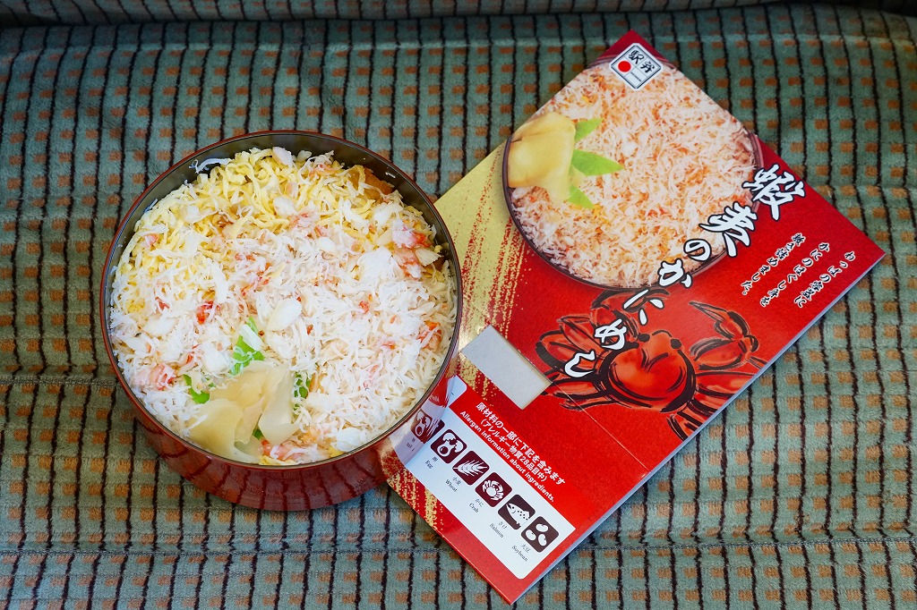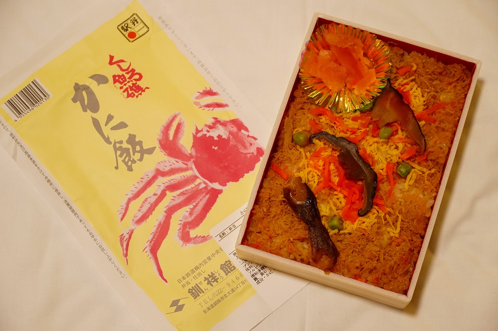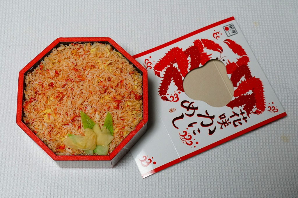 2022(令和4)年9月1日に釧路駅などで発売。とはいえその姿は、旭川駅かどこかの北海道駅弁やその催事で、見慣れたものだと思う。旭川駅弁「蝦夷わっぱ」などでも使われる、一瞬は漆塗りの器に見えるかもしれない赤いプラ製の容器に、醤油飯を詰め、錦糸卵とカニフレークで覆い、甘酢生姜を添える。冷蔵便で輸送販売される駅弁としては、この姿でよい、この姿がよいのだろう。令和の時代になっても、北海道の駅でカニの駅弁が買えるという需要に応えられる。
