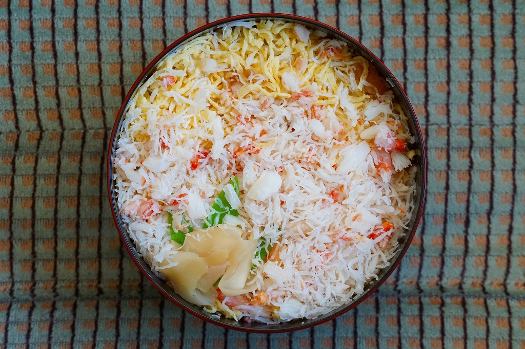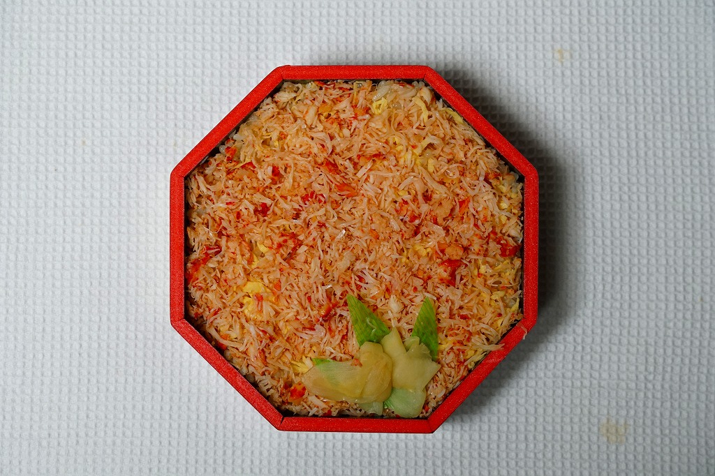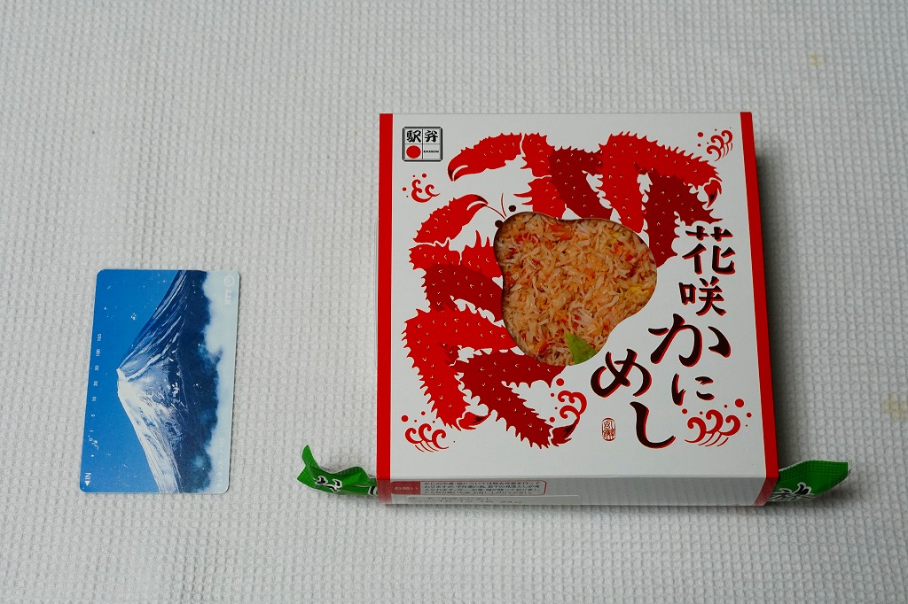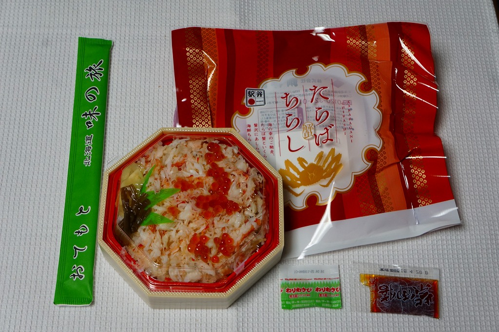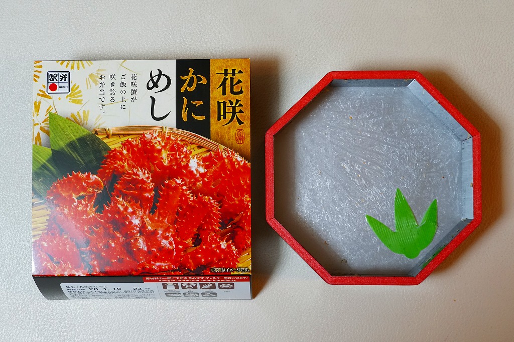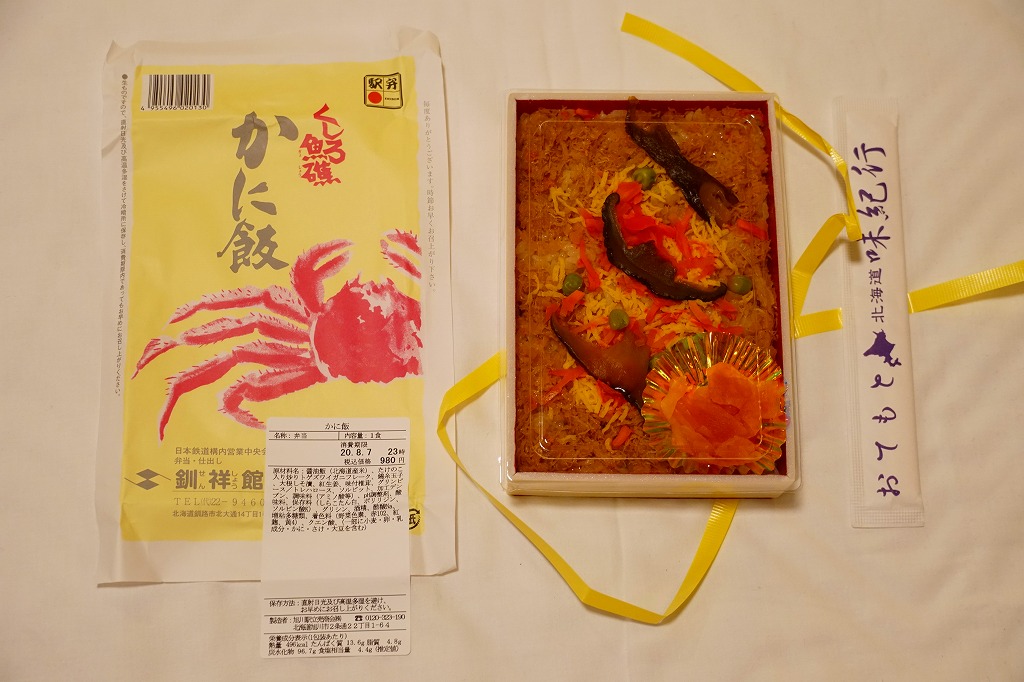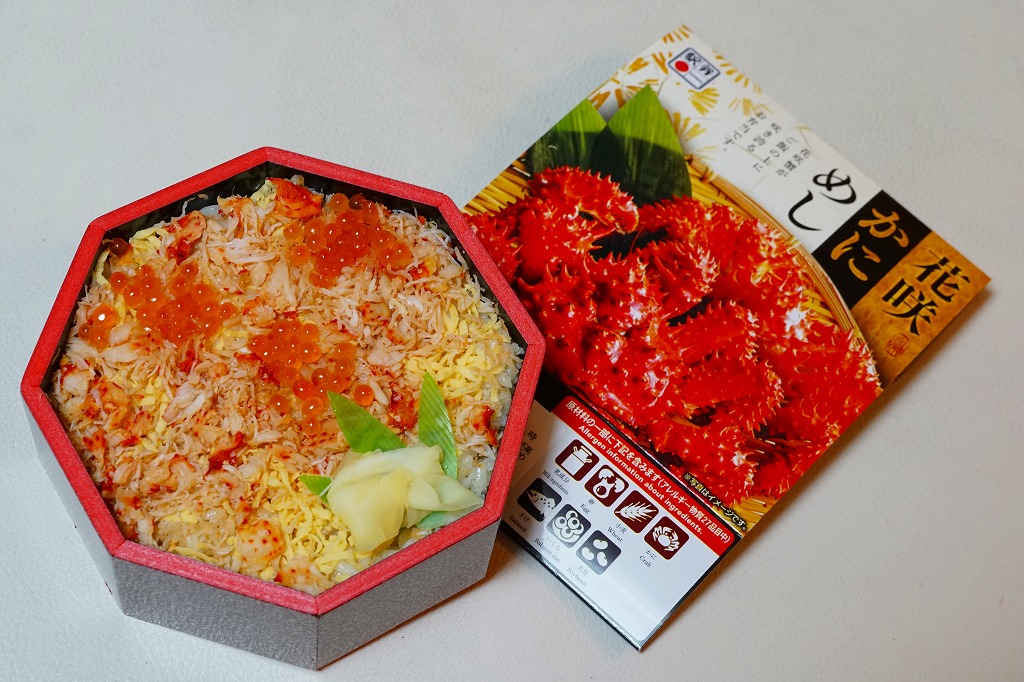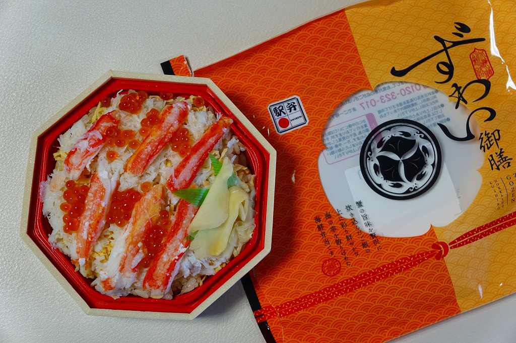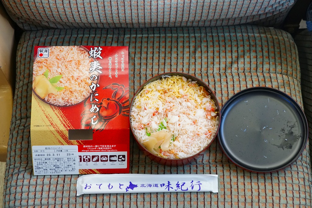 2022(令和4)年9月1日に釧路駅などで発売。とはいえその姿は、旭川駅かどこかの北海道駅弁やその催事で、見慣れたものだと思う。旭川駅弁「蝦夷わっぱ」などでも使われる、一瞬は漆塗りの器に見えるかもしれない赤いプラ製の容器に、醤油飯を詰め、錦糸卵とカニフレークで覆い、甘酢生姜を添える。冷蔵便で輸送販売される駅弁としては、この姿でよい、この姿がよいのだろう。令和の時代になっても、北海道の駅でカニの駅弁が買えるという需要に応えられる。
